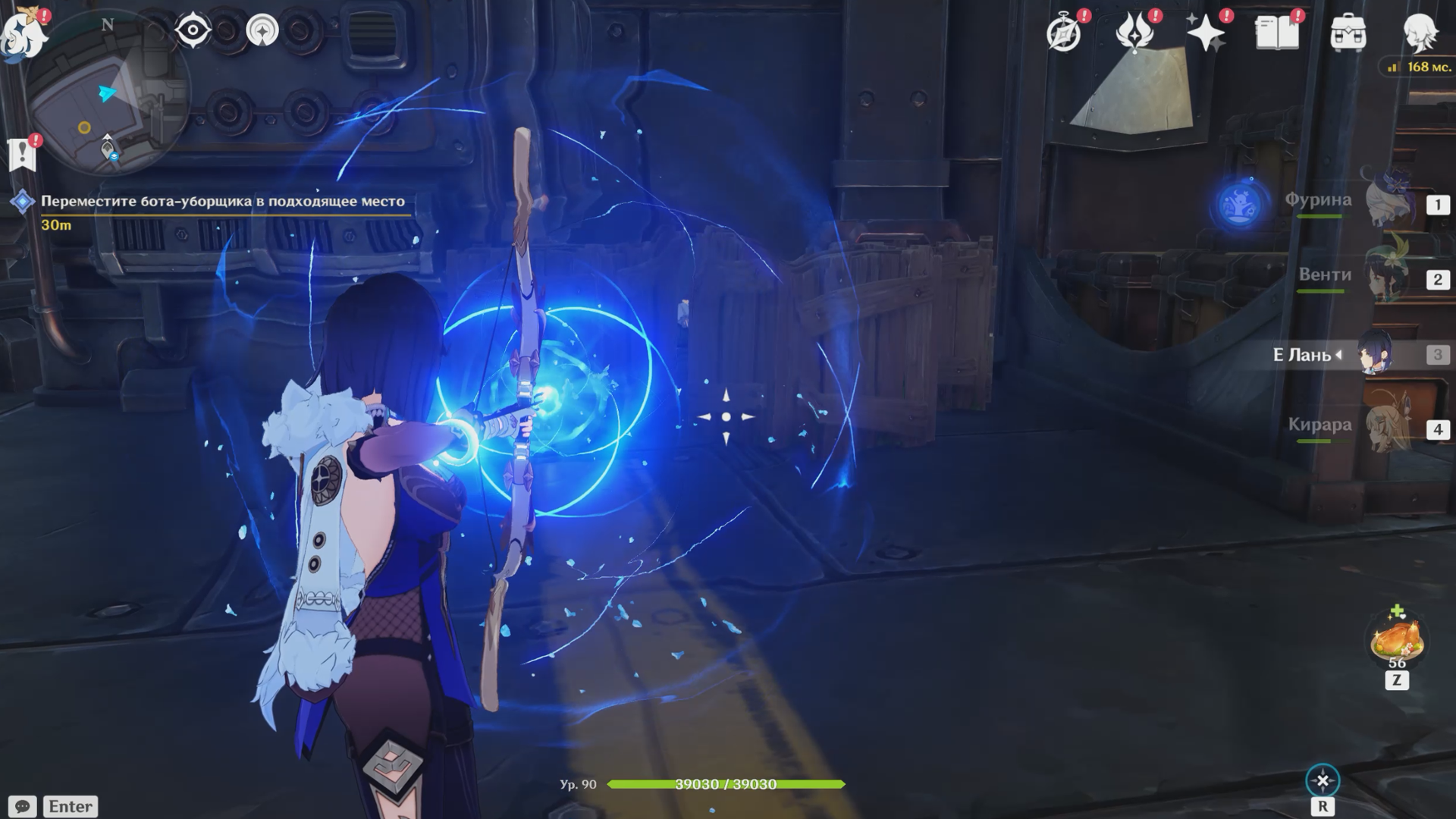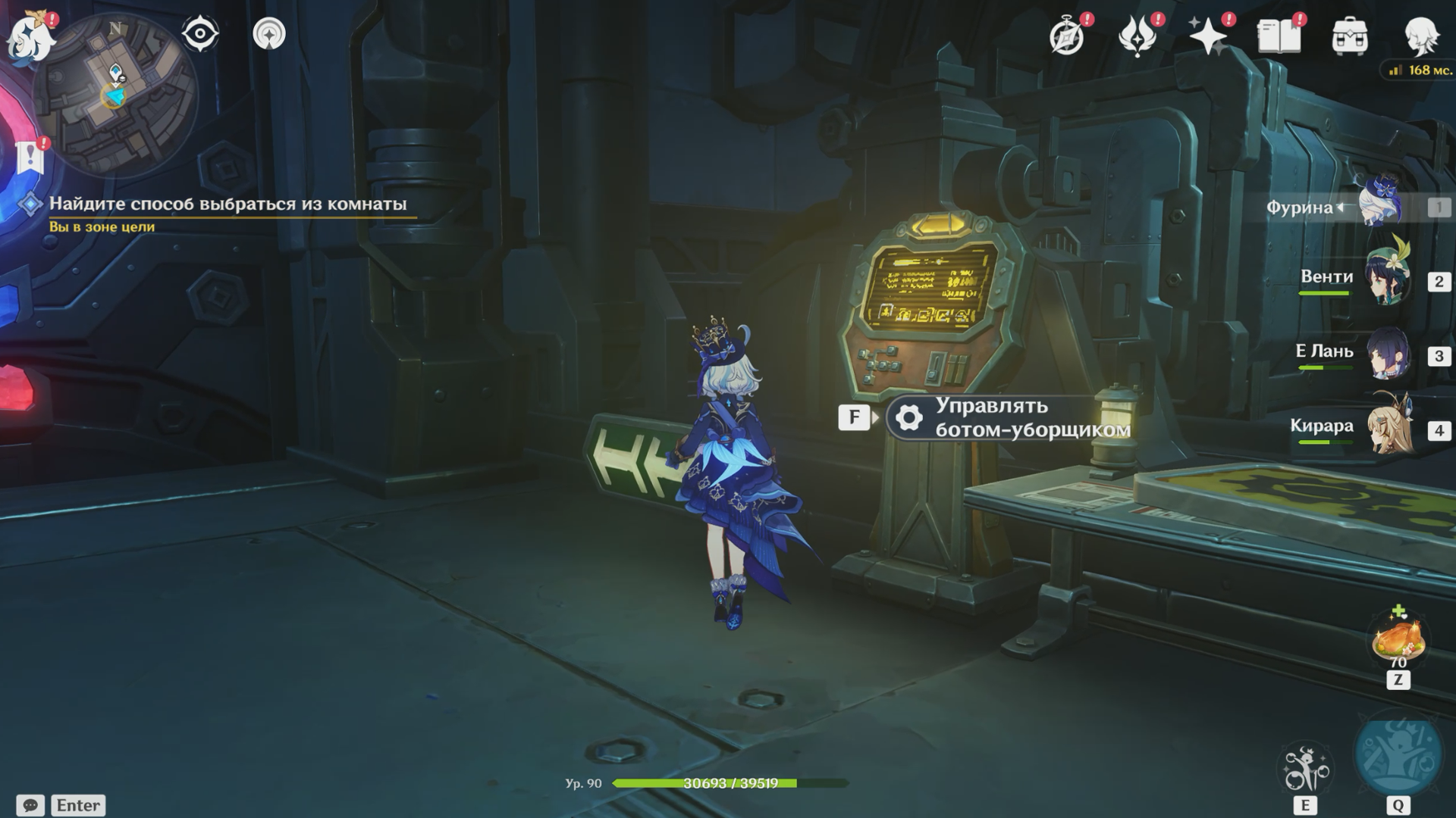 После кат-сцены возьмите управление роботом. Если Фатуи что-то подозревают, убирайте грязь на полу, чтобы они отвлеклись.