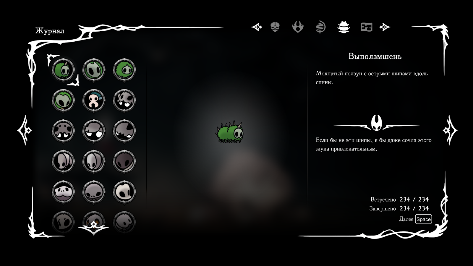 Полный журнал в Hollow Knight Silksong включает более 230 существ и боссов, обитающих в разных областях Фарлума. Чтобы получить все записи в журнале, необходимо исследовать каждую локацию и побеждать всех врагов, включая редких и квестовых. Ниже приведен список по регионам.