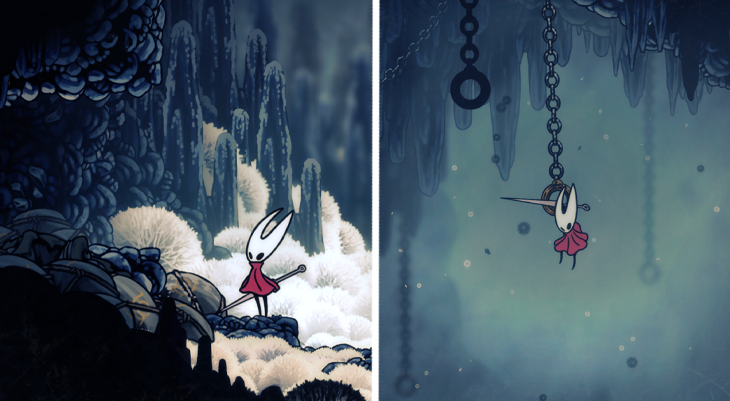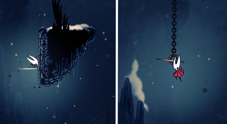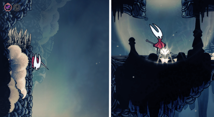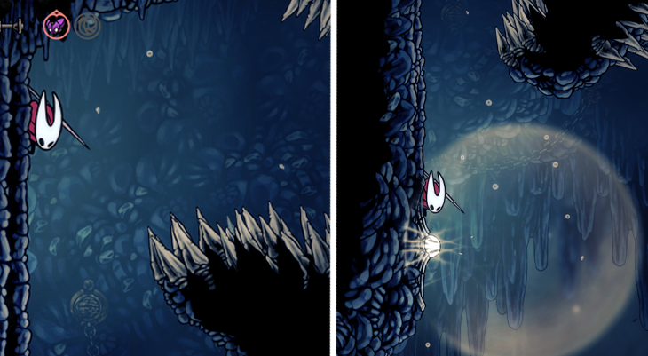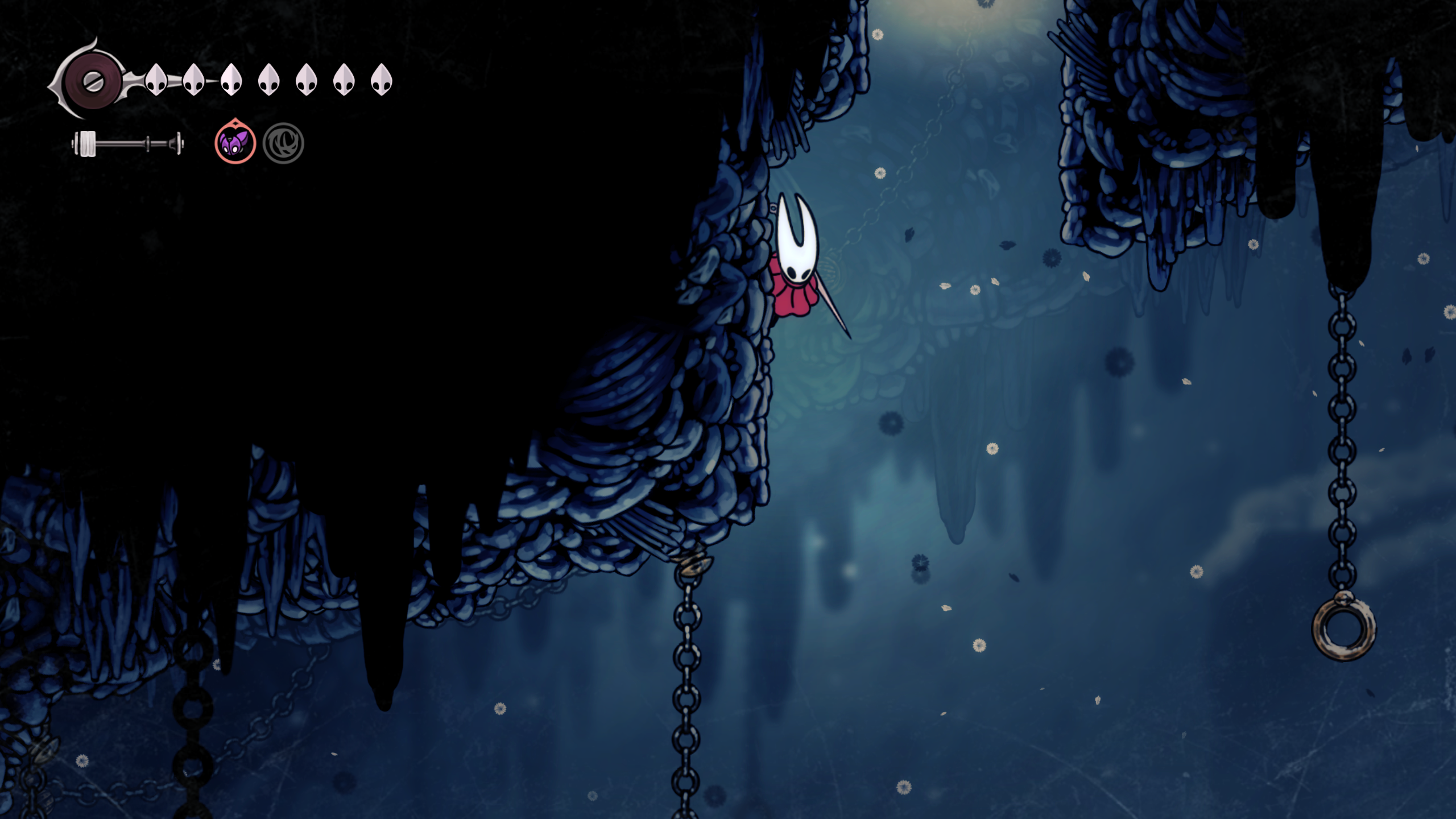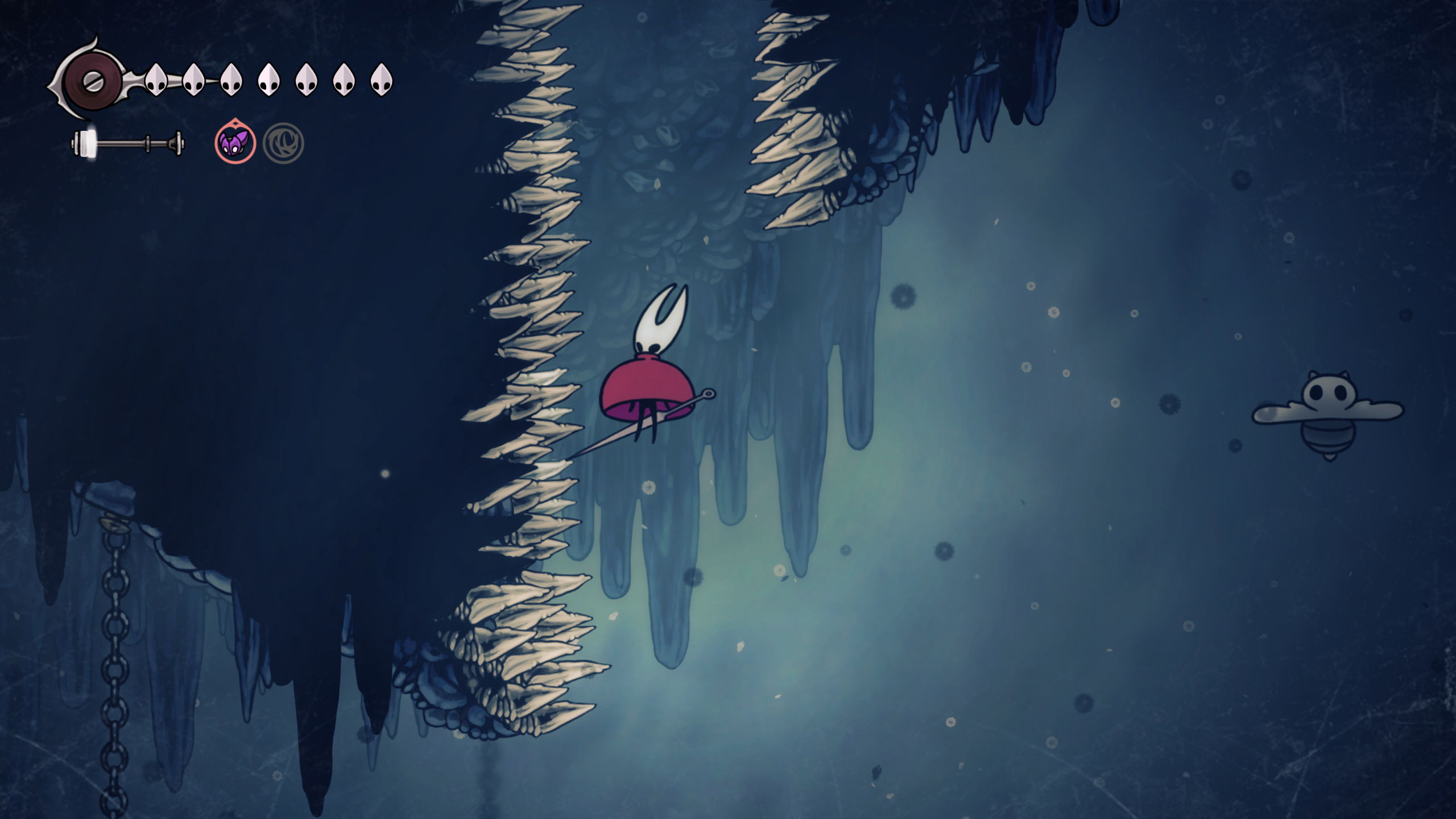В следующей комнате используйте Гарпун сначала за платформе, потом – на мухе. Когда Хорнет отскочит, зацепитесь за кольцо.