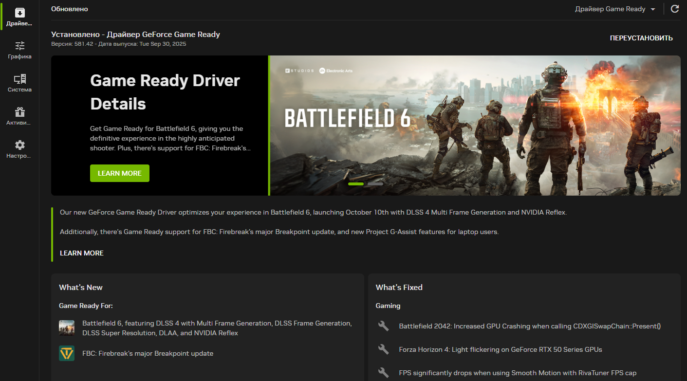 Например, Nvidia выпустила специально оптимизированную версию драйверов под Battlefield 6 еще 30 сентября. За прошедшее с релиза время пользователи не жаловались на проблемы с ними, поэтому можно смело устанавливать.