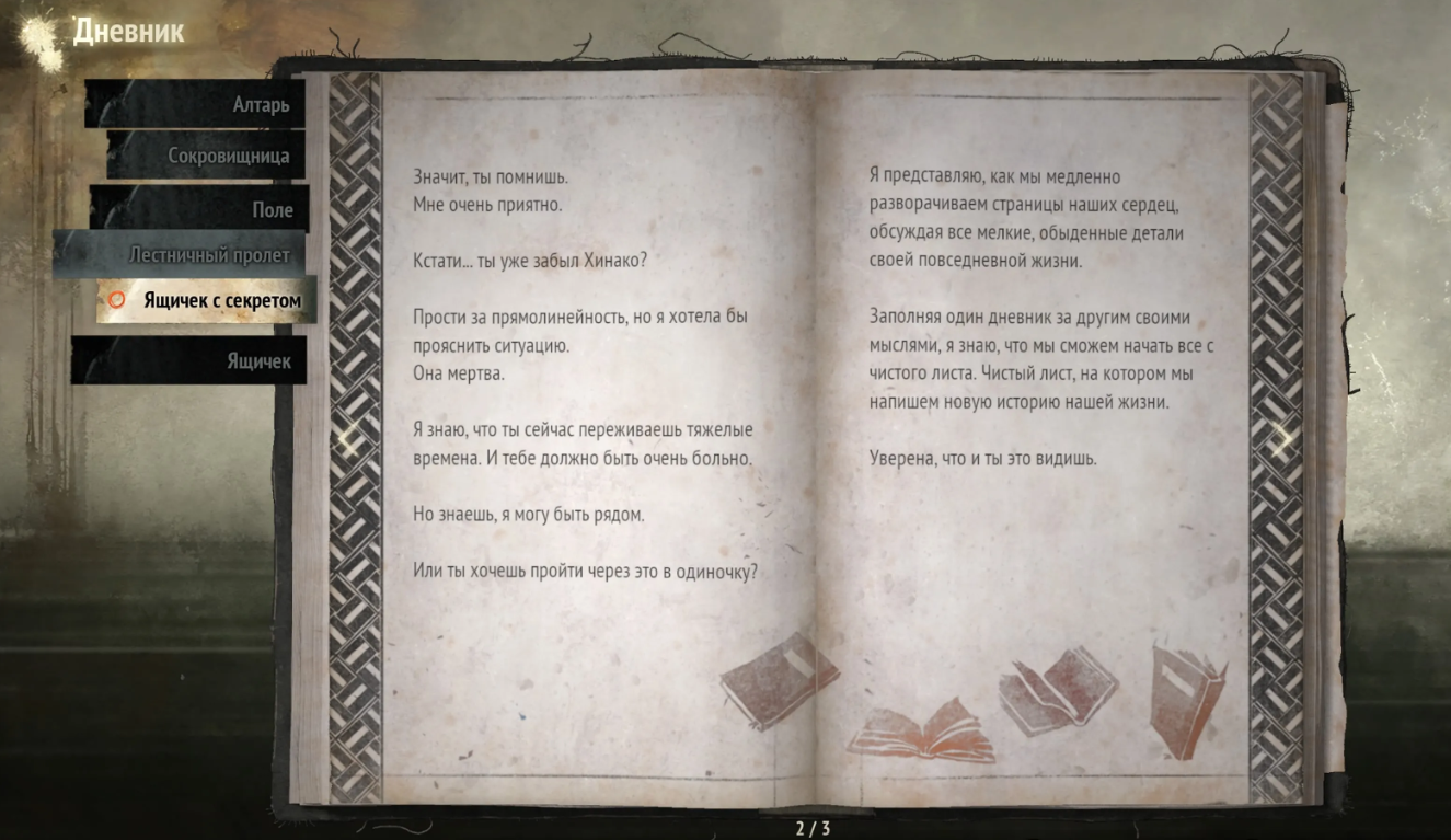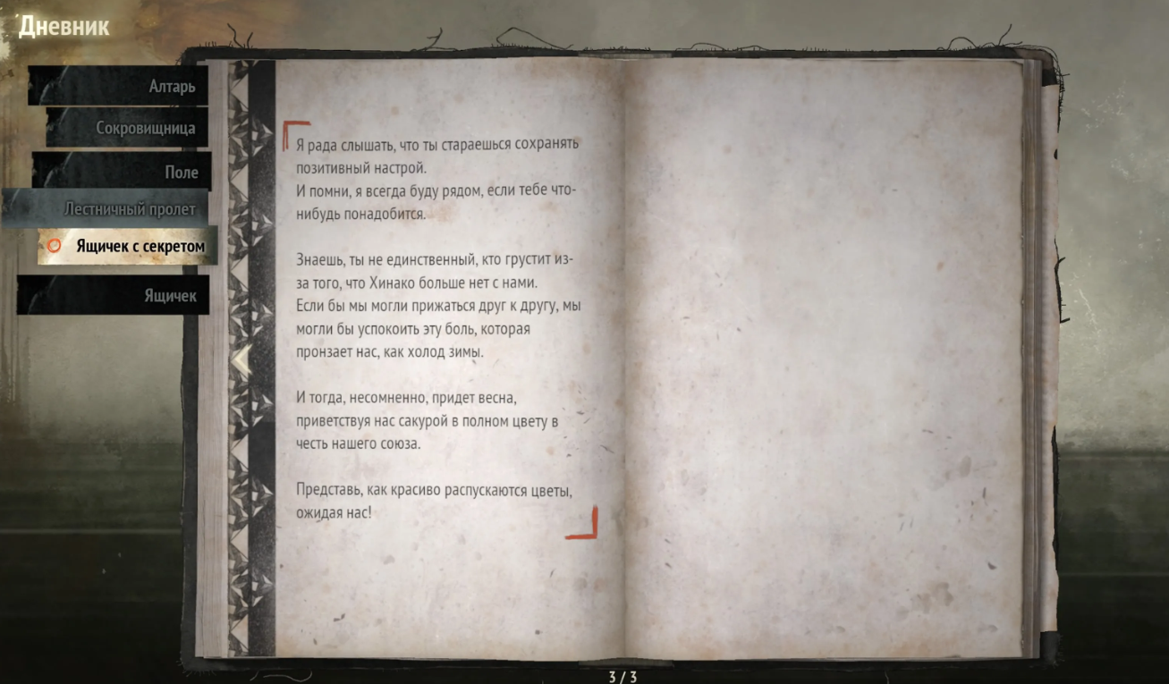 Ориентироваться следует на любовные записки Ринко к Сю. Первое послание лежит на столе рядом со шкатулкой. После того как вы откроете ящик впервые, получите второе письмо, затем третье и, наконец, финальное – в награду за завершение головоломки. Всего записок четыре: три из них содержат подсказки для решения, а последняя служит эпилогом этой небольшой истории.