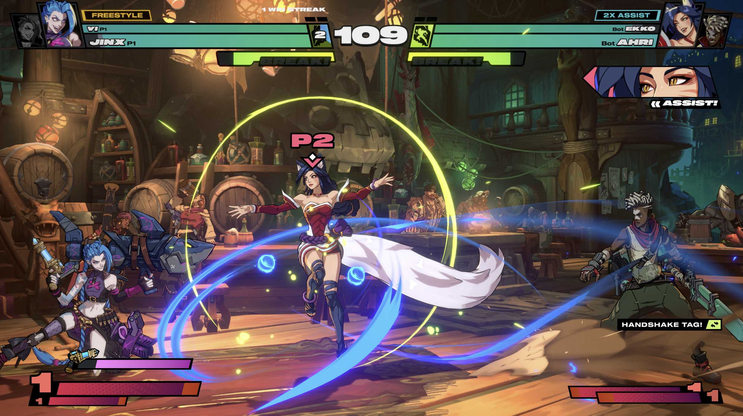 Еще 2XKO хороша тем, что в нее можно играть с другом. В режиме Duos каждый управляет своим персонажем – согласитесь, приятно рубиться в одной команде с корешем того же мастерства. Также это добавляет возможность познакомить новичков с жанром!