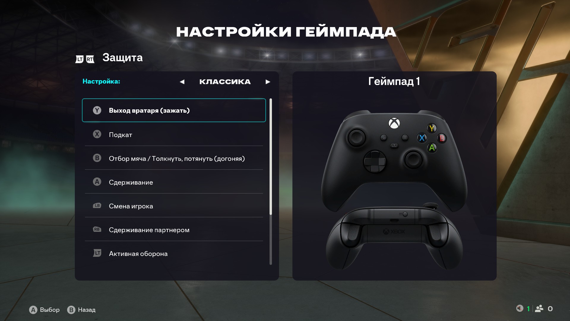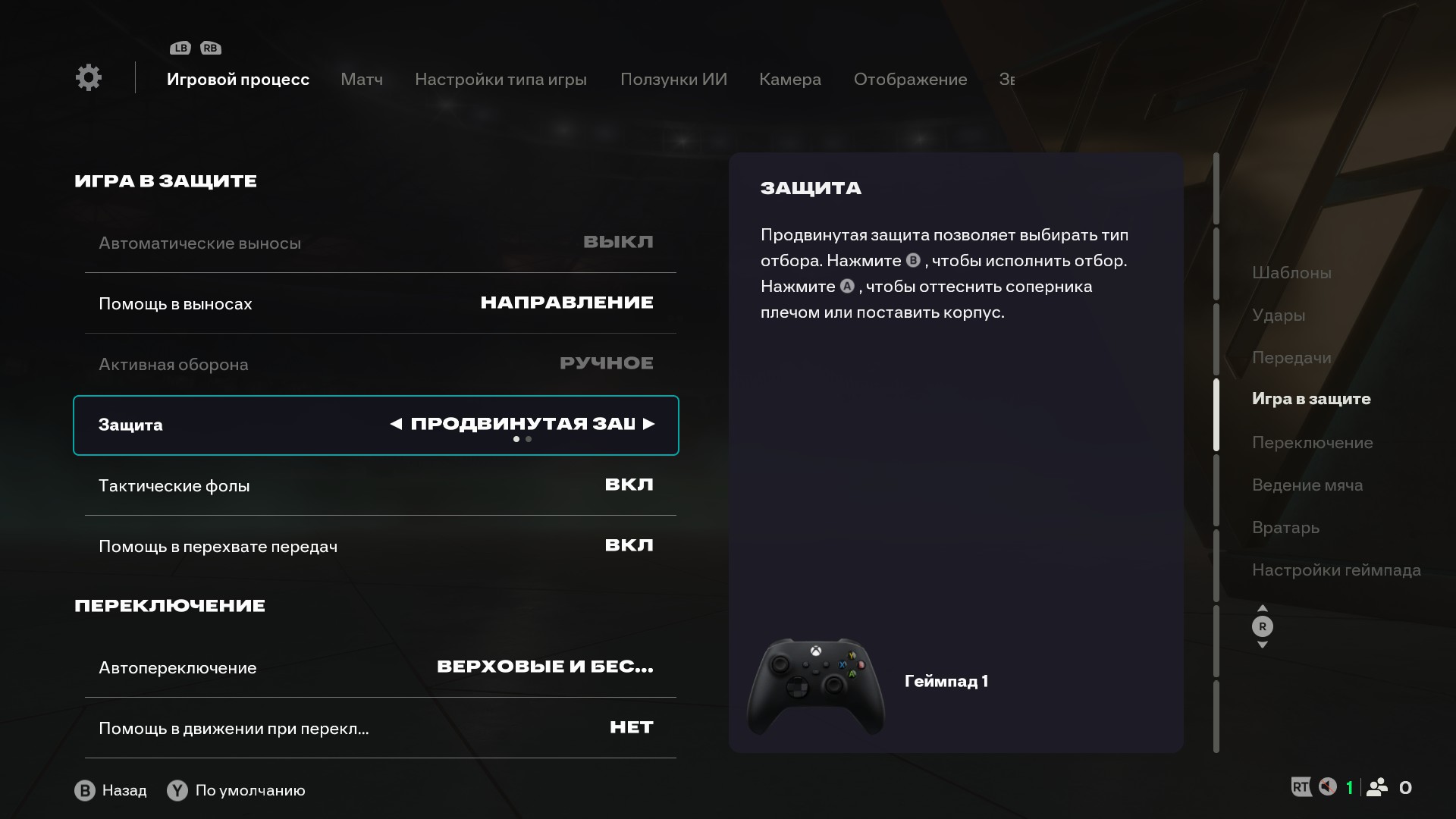 Перейдем к настройке управления. Стандартная раскладка понравится большинству игроков, но вы можете настроить ее под свой стиль. Например, «Выходы вратаря» используются в игре редко и их можно поменять местами с более актуальным «Сдерживанием партнером» (Y/треугольник на RB/R1). Отбор и толчки корпусом (в «Продвинутой защите») или сдерживание (в «Тактическое защите») можно переставить местами (с B/круг на A/X и наоборот).