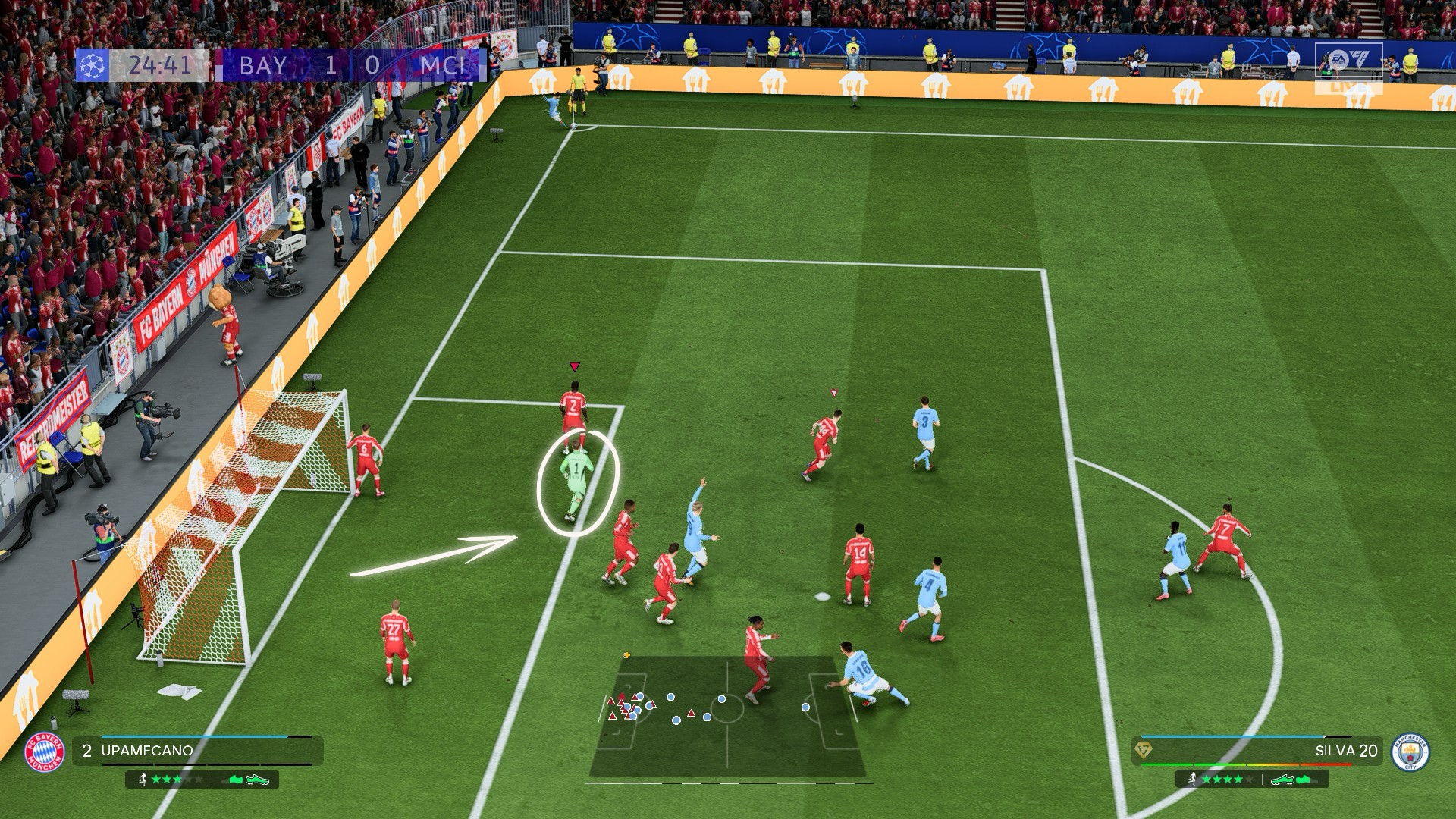 Возможности обороны на стандартах ограничены. В назначениях тактики вы можете поставить рослого игрока на ленточку, но самая опасная зона обычно находится в штрафной около ближней штанги. Передвиньте туда голкипера (нажмите на правый стик и наклоните его) или закройте соперника крепким защитником. Не выходите слишком далеко, иначе вам закрутят мяч в ворота.