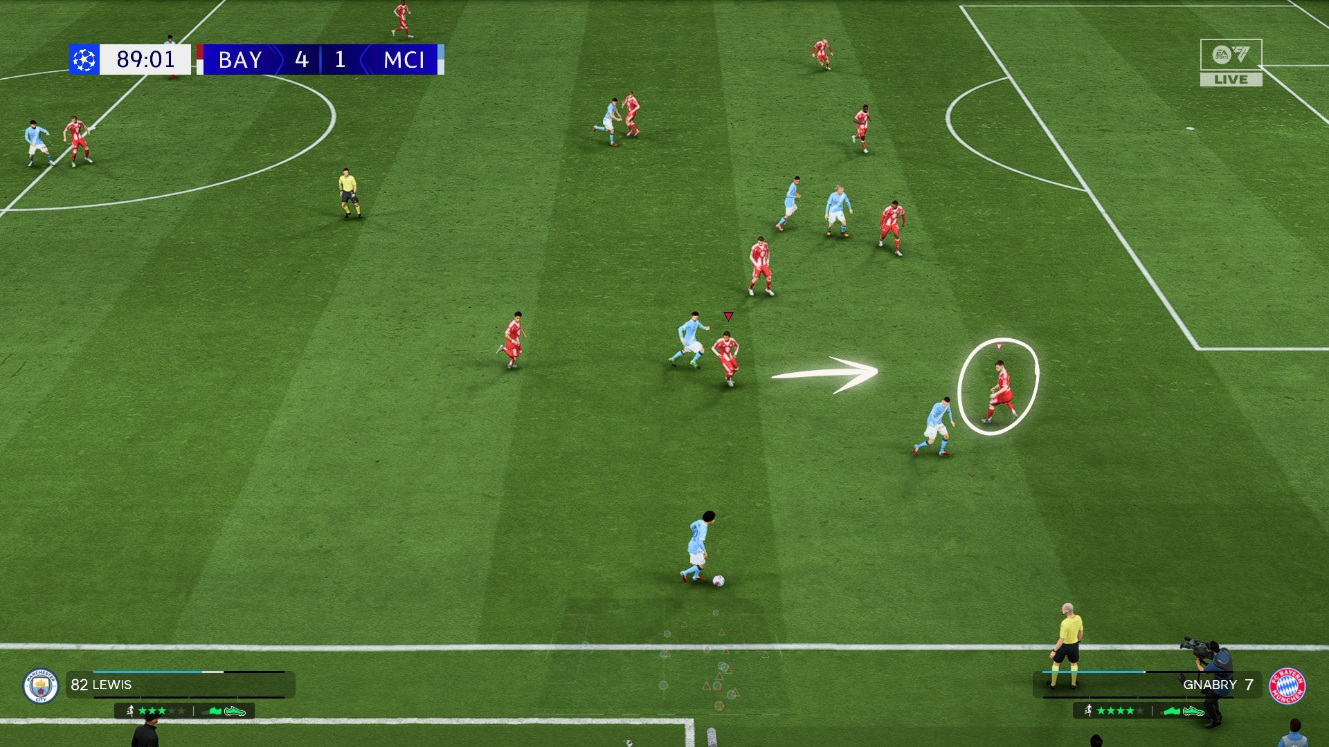 Прессингуйте в Фифе вручную или с помощью одноклубников. Обычное сдерживание партнером (RB/R1) выдергивает ближайшего игрока к мячу и направляет его в агрессивную атаку на соперника, а частичный командный прессинг (2x RB/R1) включает преследование возможных адресатов паса и помогает перехватить мяч или быстро переключиться на футболиста рядом с оппонентом.
