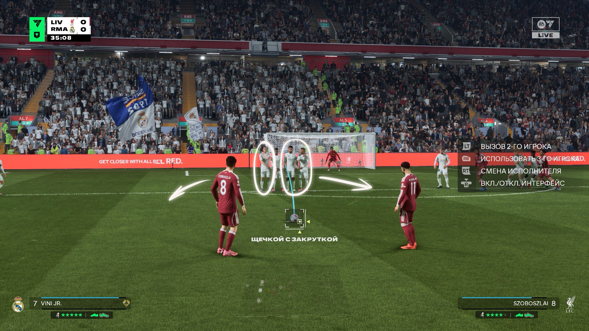Во время штрафного симулятор разрешает выбрать крайних футболистов из стенки и выдвинуть их на опасных соперников, но придется поторопиться. К позиции приклеен только последний игрок.