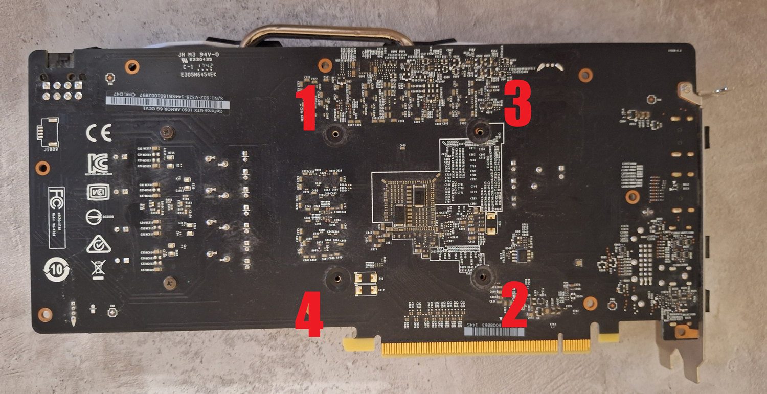 Аккуратно соедините плату и радиатор. Когда будете закручивать болты в месте контакта чипа и радиатора, закручивайте их крест-накрест, как по номерам на фото. Если же закручивать по кругу, то есть шанс создать с одной стороны слишком сильное давление, из-за чего чип может повредиться (появится скол) и видеокарта перестанет работать.