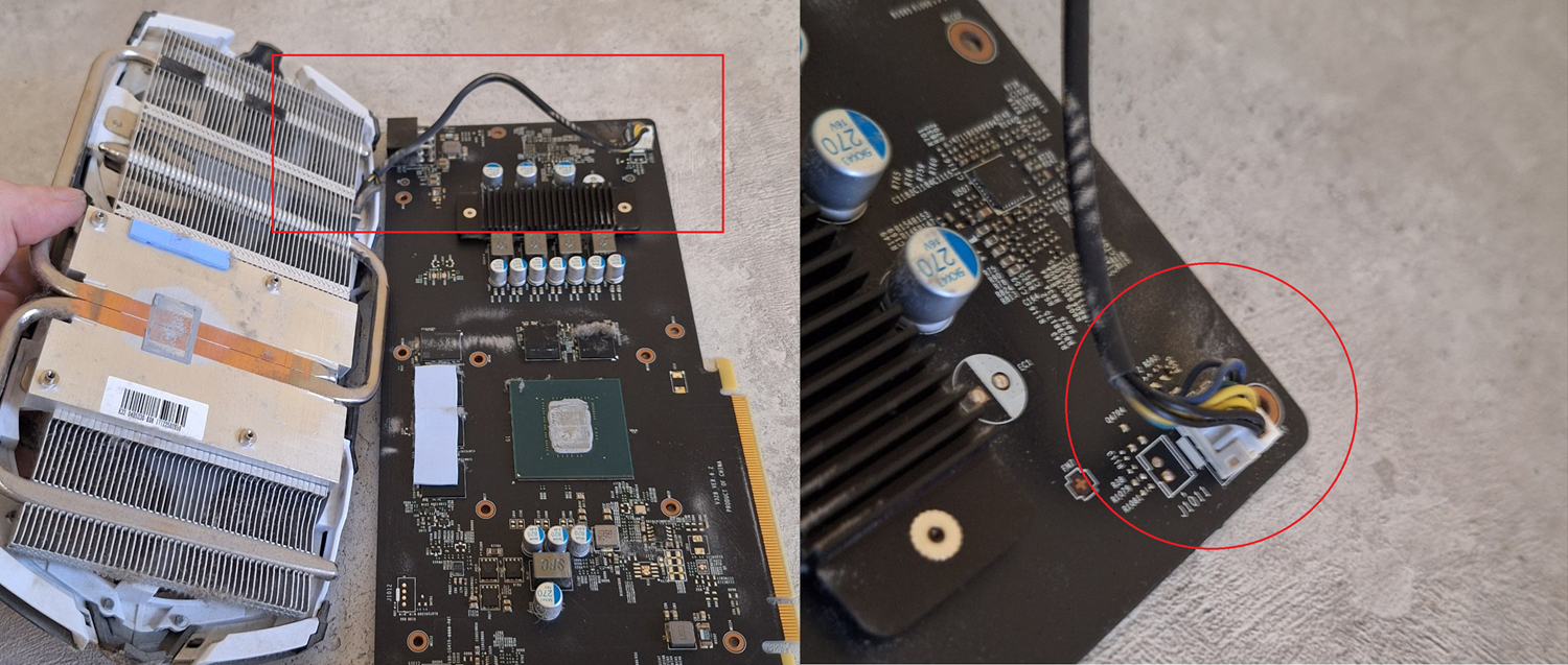 Аккуратно разъедините радиатор и плату, чтобы не оторвать кабель, питающий кулер видеокарты. Аккуратно отсоедините этот провод.
