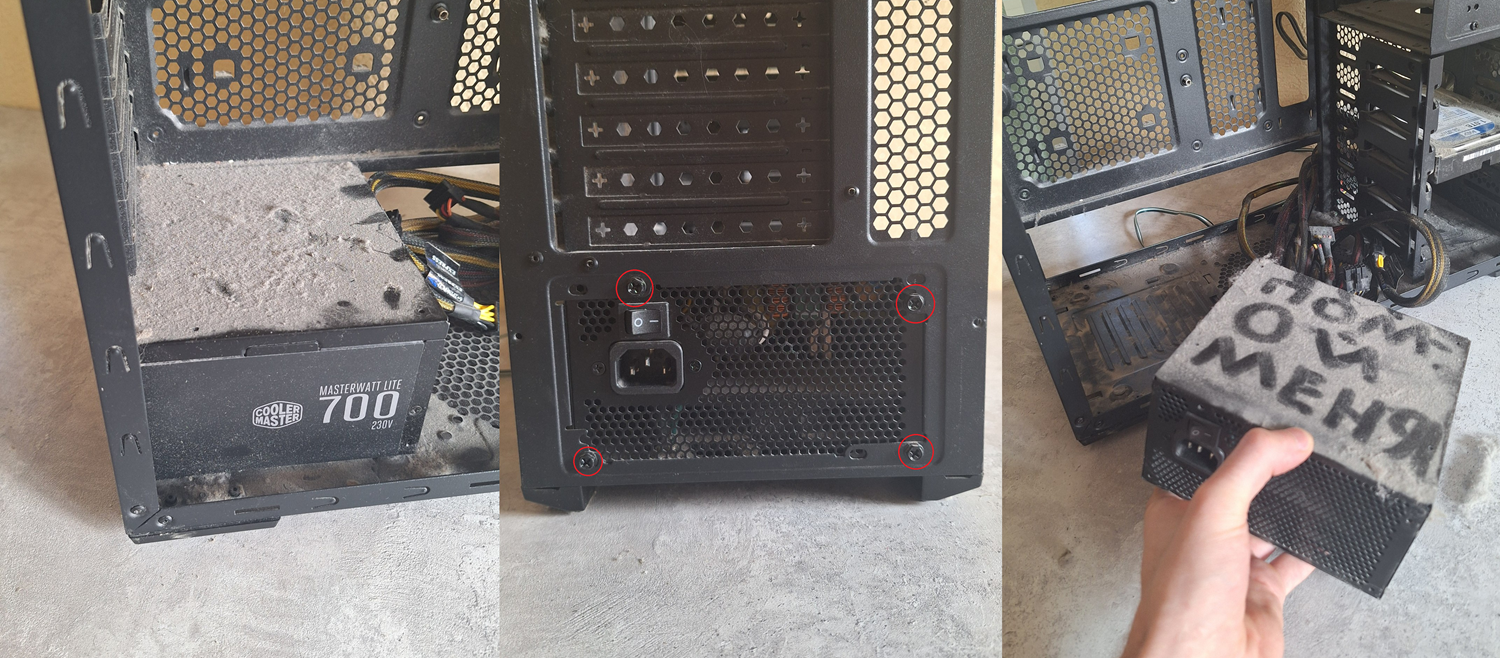 Снимаем блок питания. Он крепится сзади компьютера на 3-4 болта, просто открутите их, проверьте, не подключен ли он к другим комплектующим (например, жесткому диску. Если подключен – отключите), и достаньте его из корпуса.