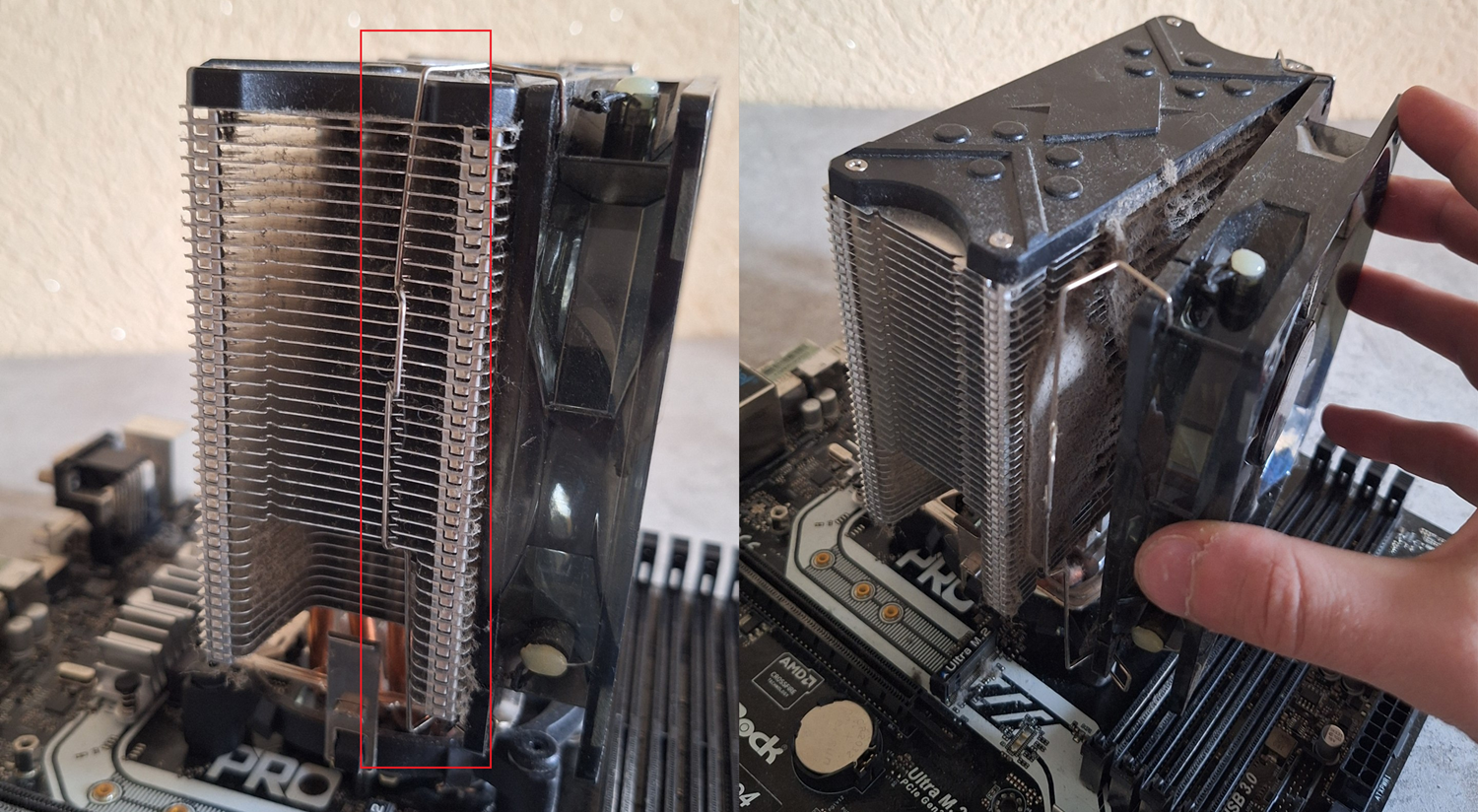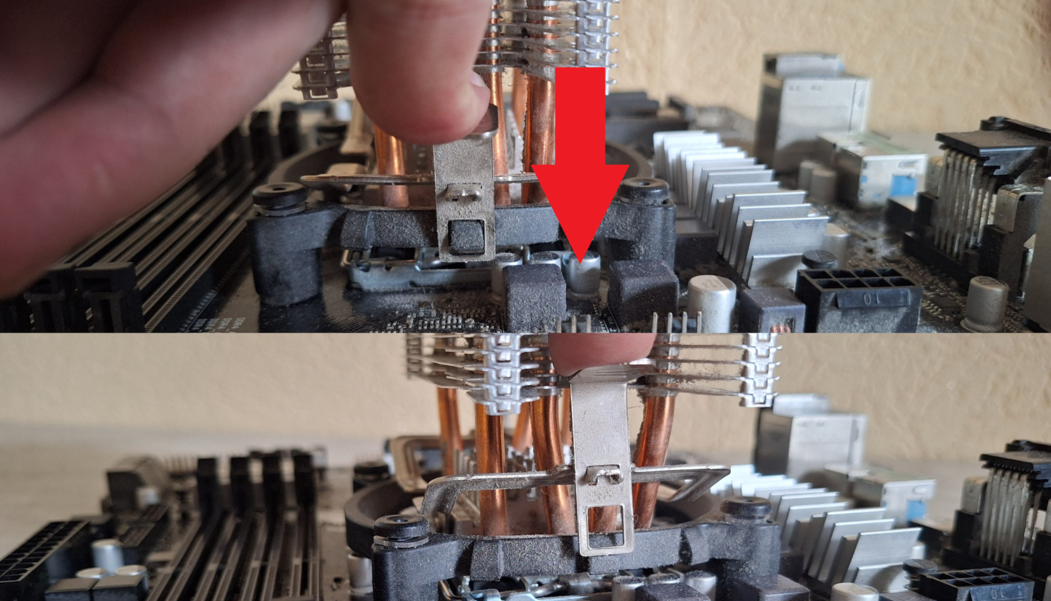 Сначала снимите кулер. Для этого найдите его крепления. Они могут выглядеть по-разному, в нашем случае – такие.