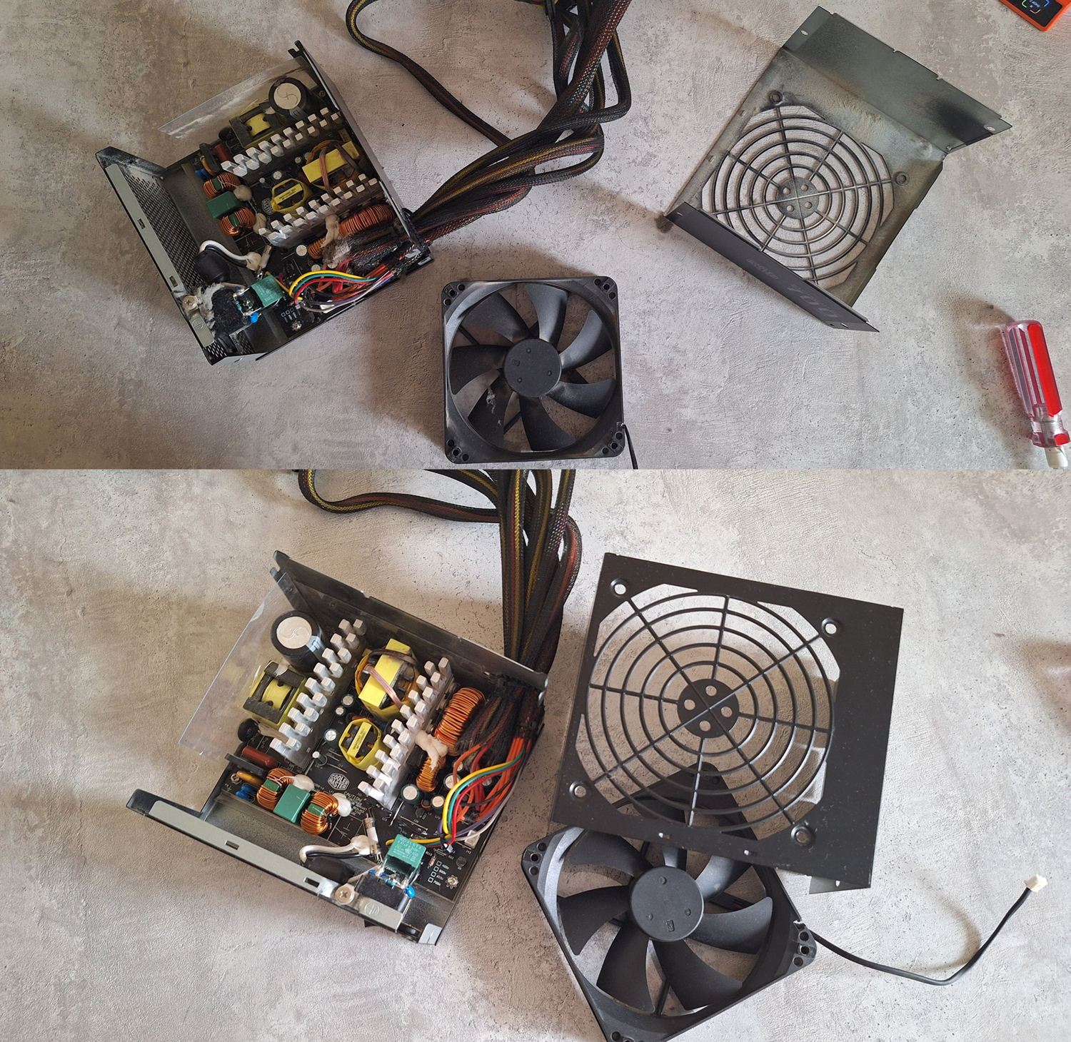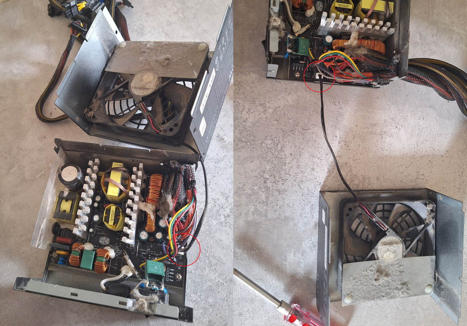 Отсоедините питание вентилятора и открутите сам вентилятор. Готово, блок питания полностью разобран, остается лишь убрать всю пыль кисточкой и воздуходувкой.
