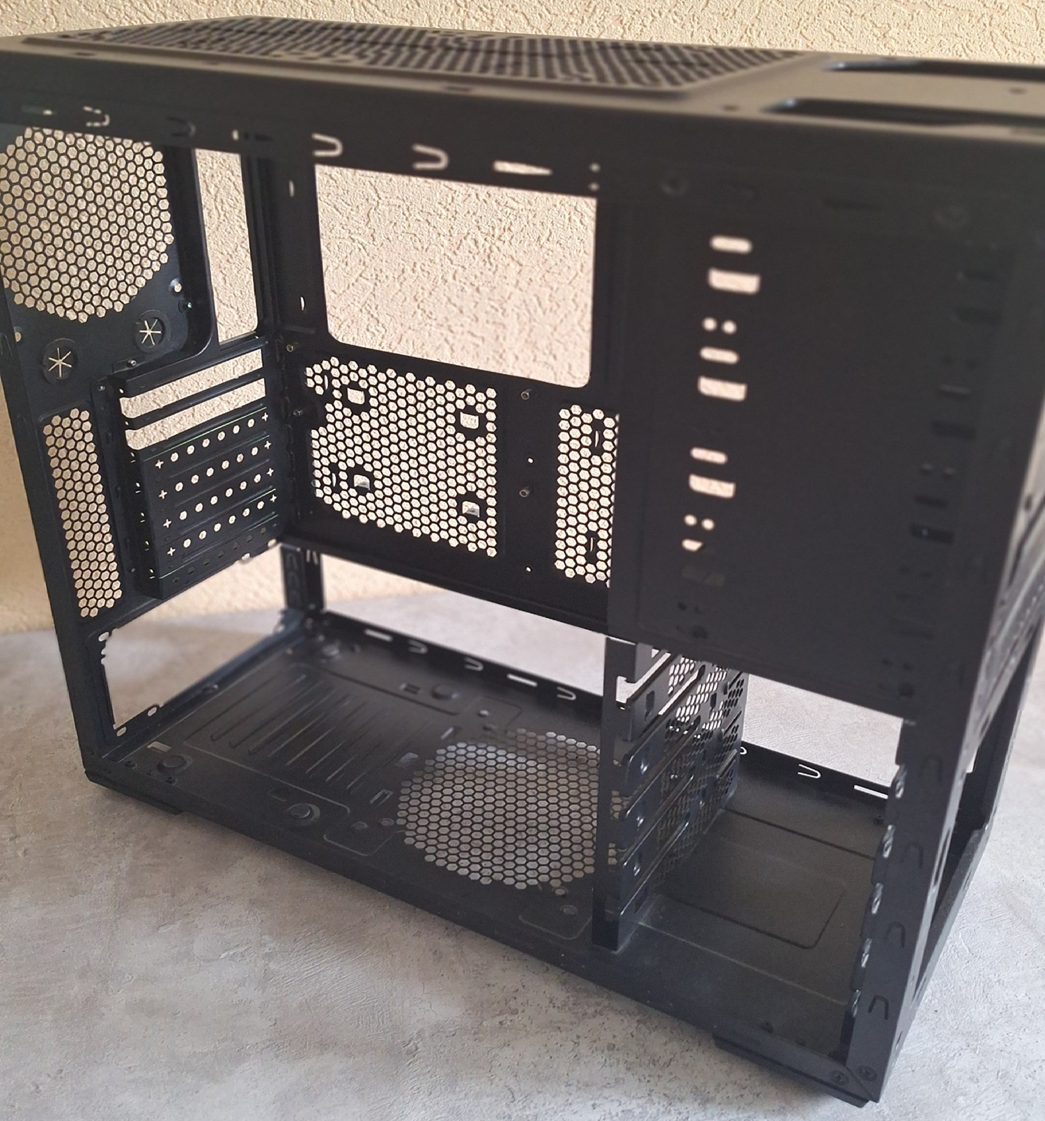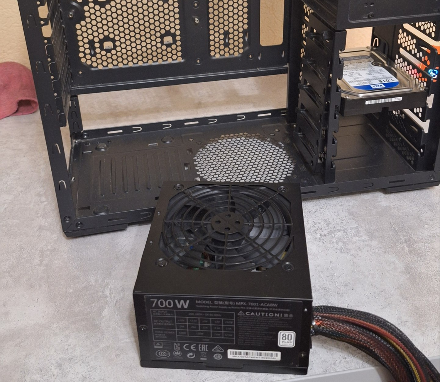 Первым делом установите HDD/SSD и блок питания в специальные отсеки.