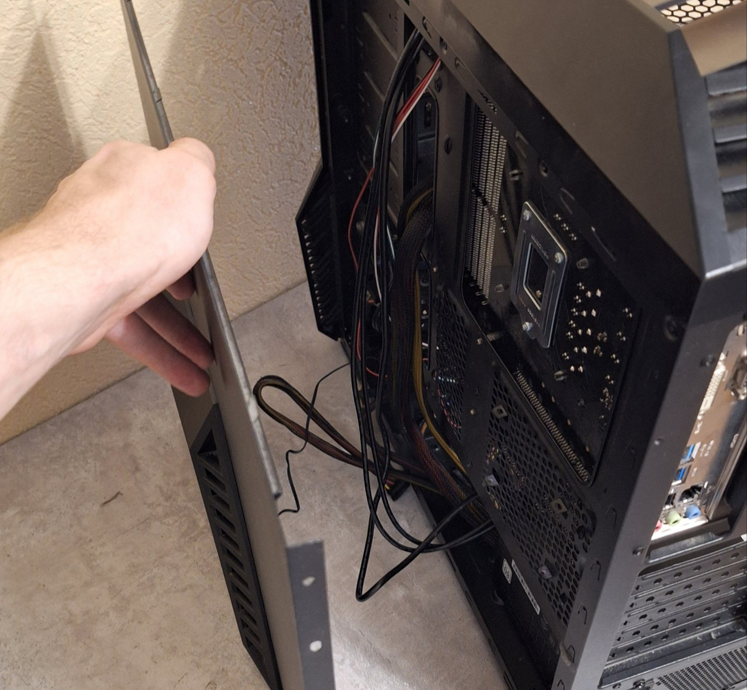 Снимаем боковые стенки. Для этого открутите болты сзади компьютера. После потяните крышку на себя. Если у вас есть вентиляторы, установленные на боковые стенки, то аккуратно, не дергая крышку, отключите их от питания.