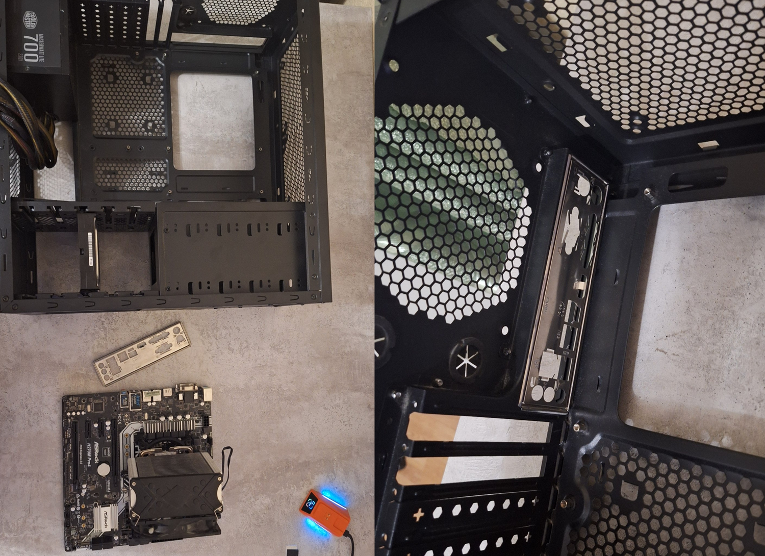 После надо установить материнскую плату. Не забудьте про металлическую заглушку! Она вставляется в корпус первой.