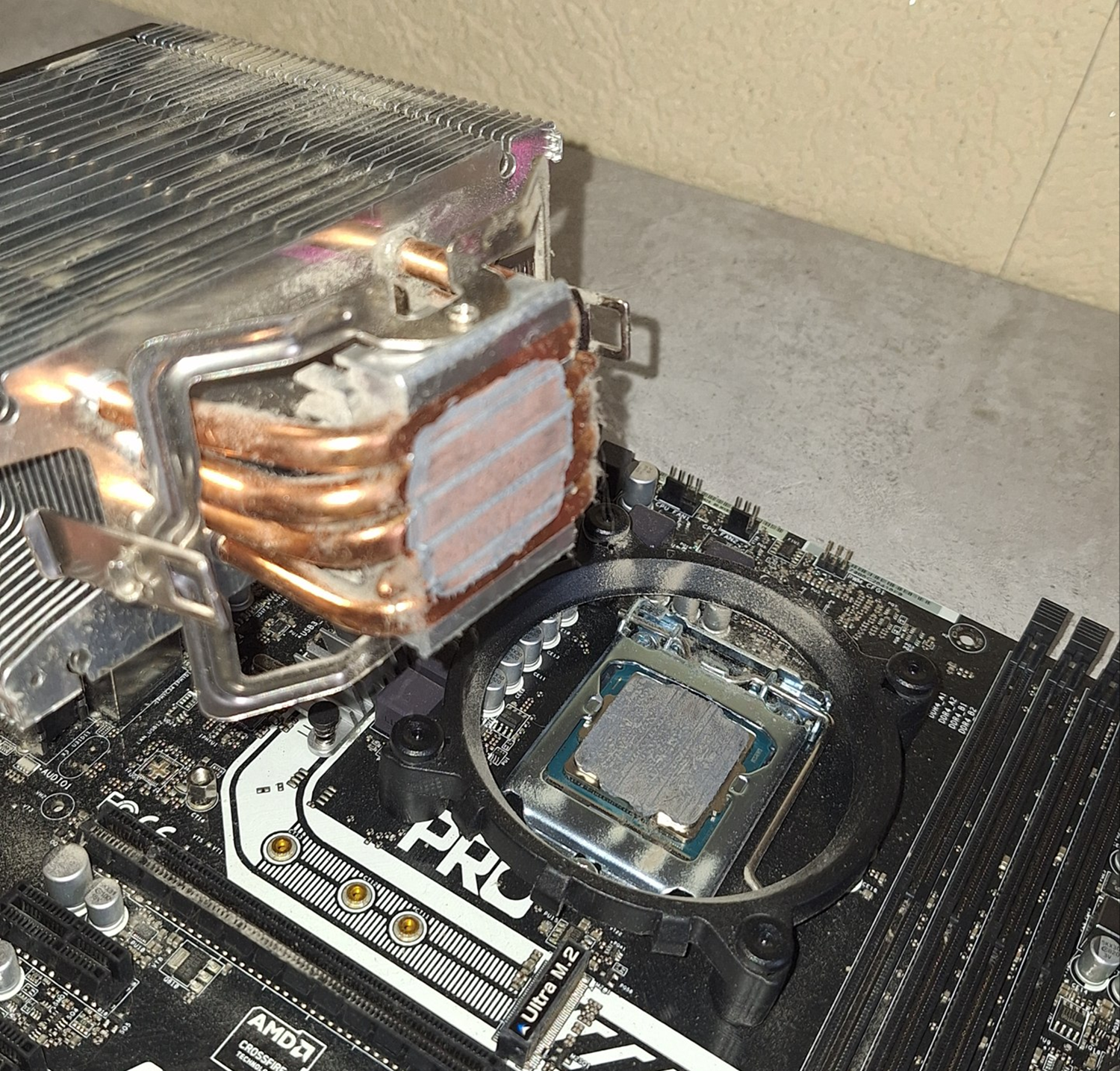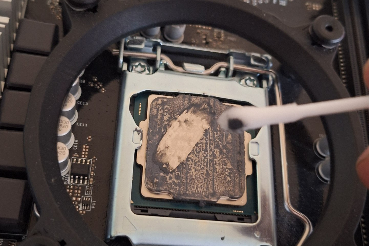 Нужно оттереть старую термопасту – для этого возьмите спиртовые салфетки или, как я, ватные палочки, смоченные спиртом. Не забудьте протереть не только процессор, но и дно кулера.