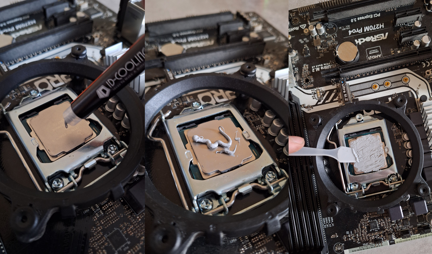 Выдавливайте ее посередине процессорной крышки, а после можете или размазать тонким слоем, или просто придавить кулером – разницы в отводе тепла практически не будет.