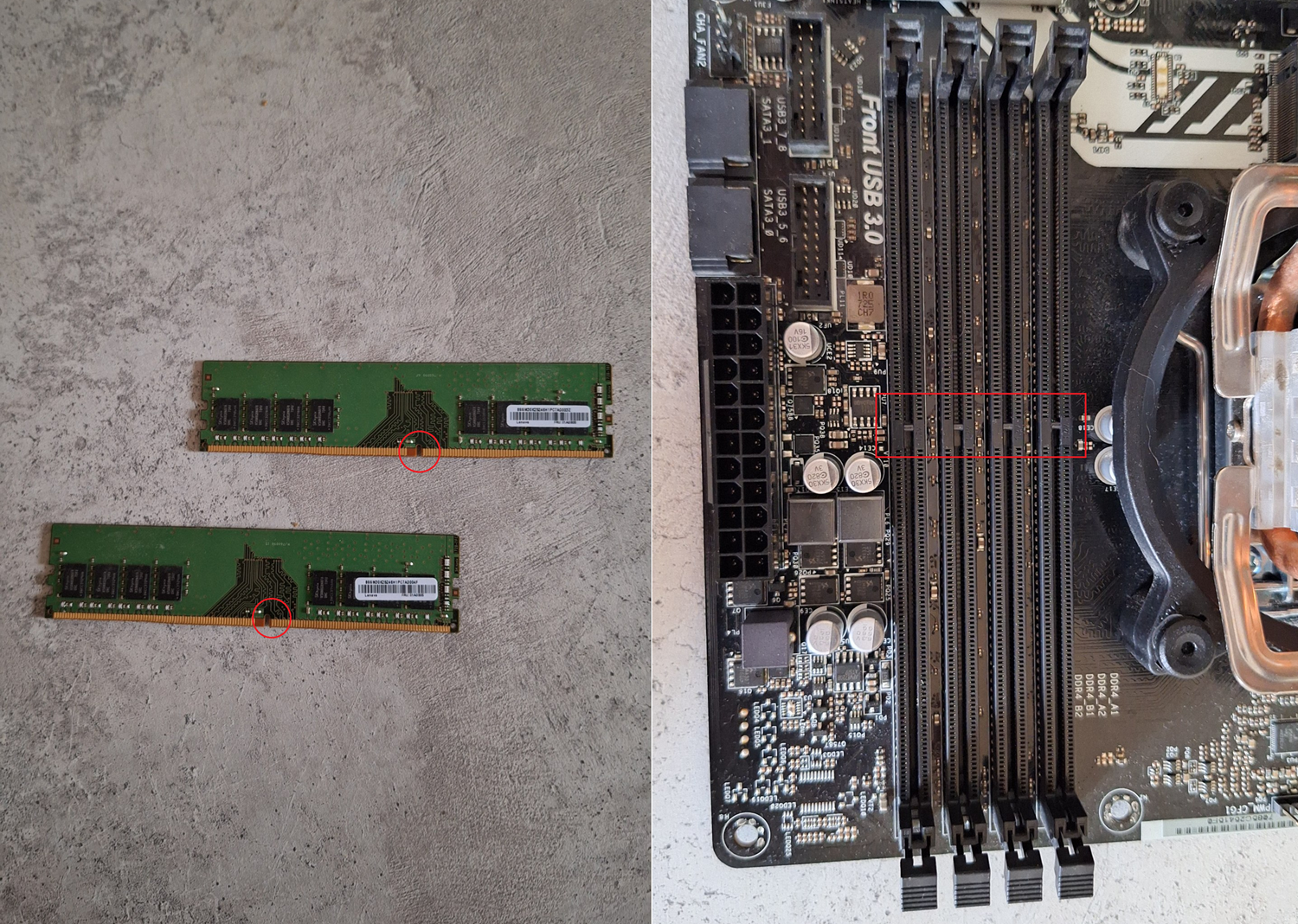 Сдуйте остатки ластика. После надо вставить память обратно по ключам. Ключи – вот такие выемки на планках оперативки, а в слотах на материнской плате есть выступы, которые под них подходят.