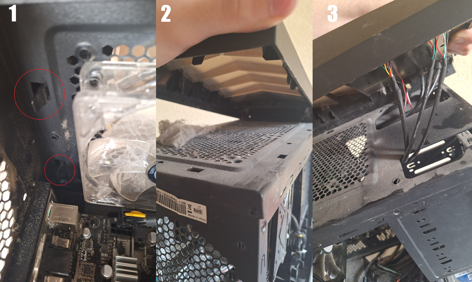 Снимаем верхнюю и переднюю панели. Для доступа ко второму вентилятору необходимо снять верхнюю крышку. Скорее всего, ее не будет в вашем компьютере, и ее функции (USB-порты, кнопка перезагрузки) возьмет на себя передняя панель. Смысл их крепления примерно одинаковый: необходимо поддеть пластиковые защелки (или просто потянуть крышку на себя) и аккуратно вынуть ее вместе с проводами.