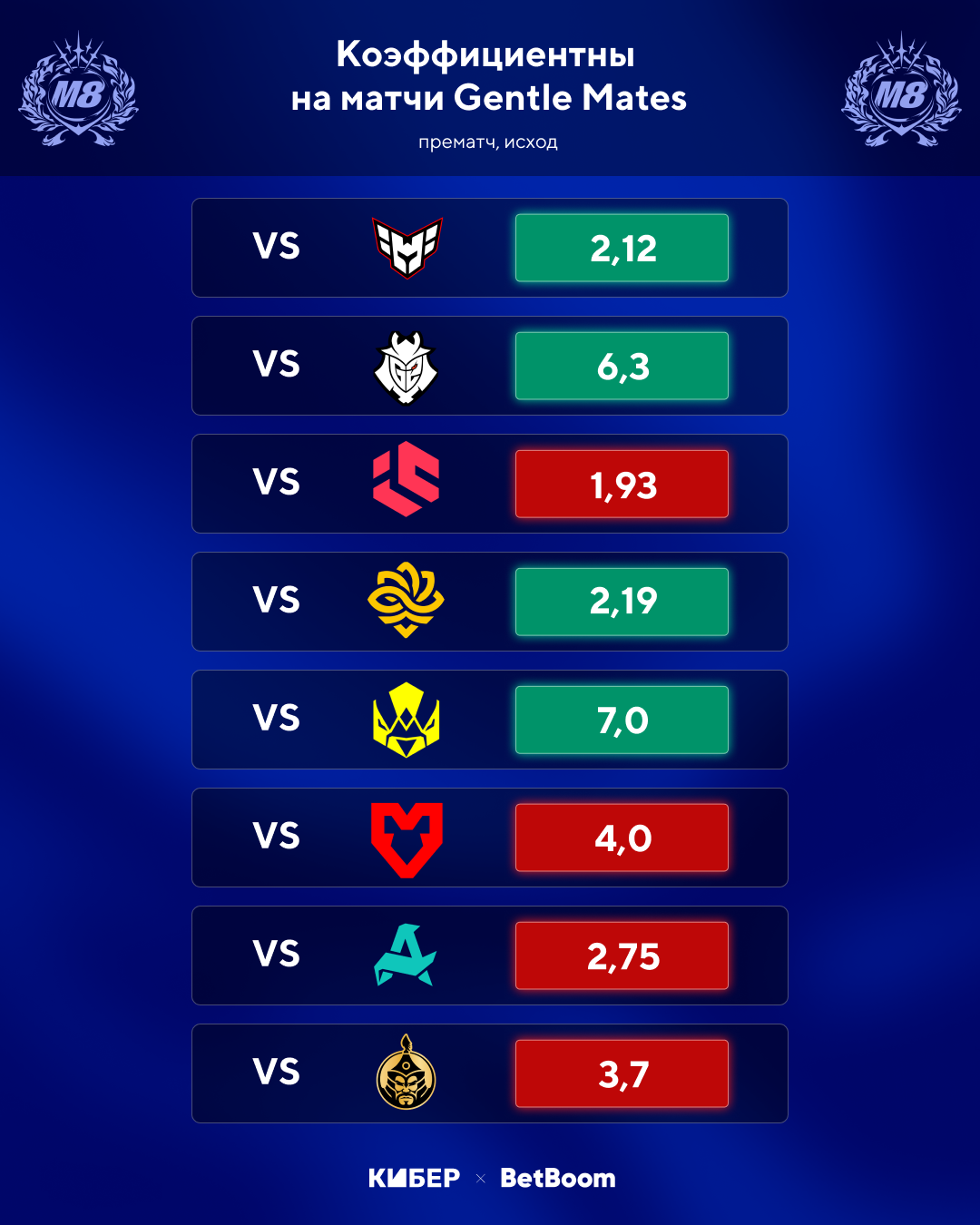 Второе и третье место в рейтинге высоких кэфов за Gentle Mates. Победа испанцев над VItality возвращала ставку в семикартном размере. На победу над G2 кэф доходил до 6,3.