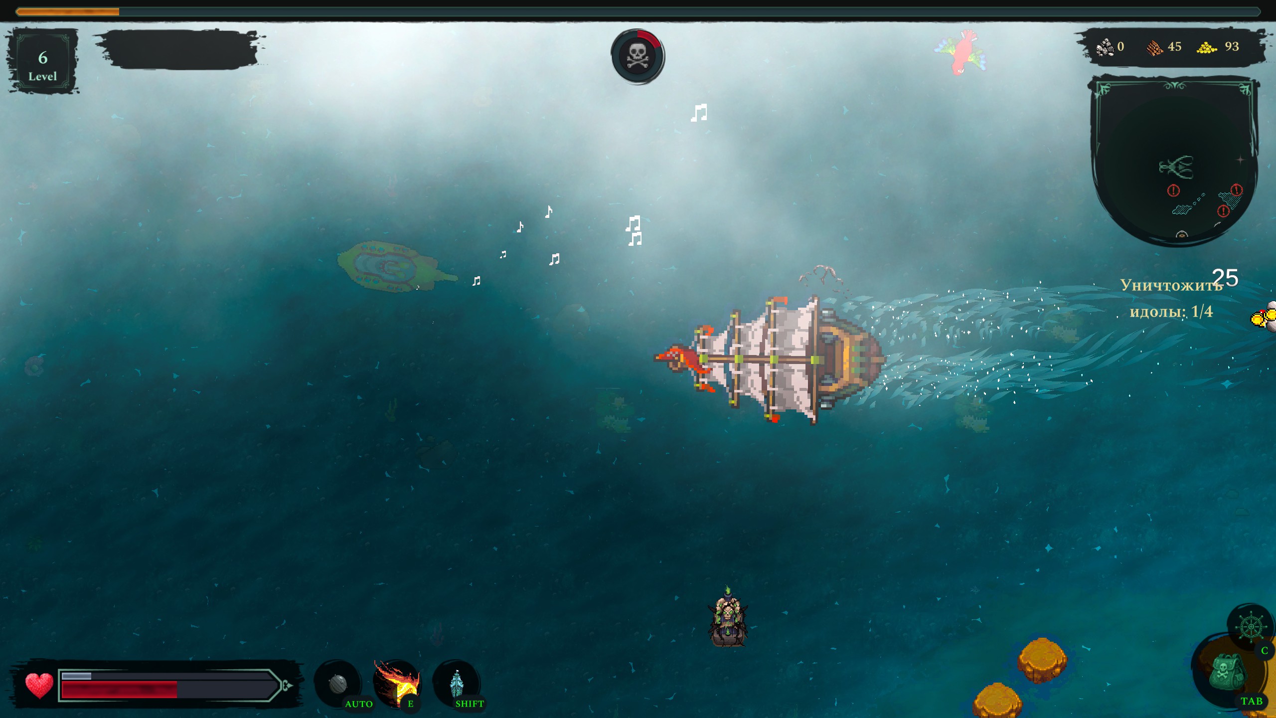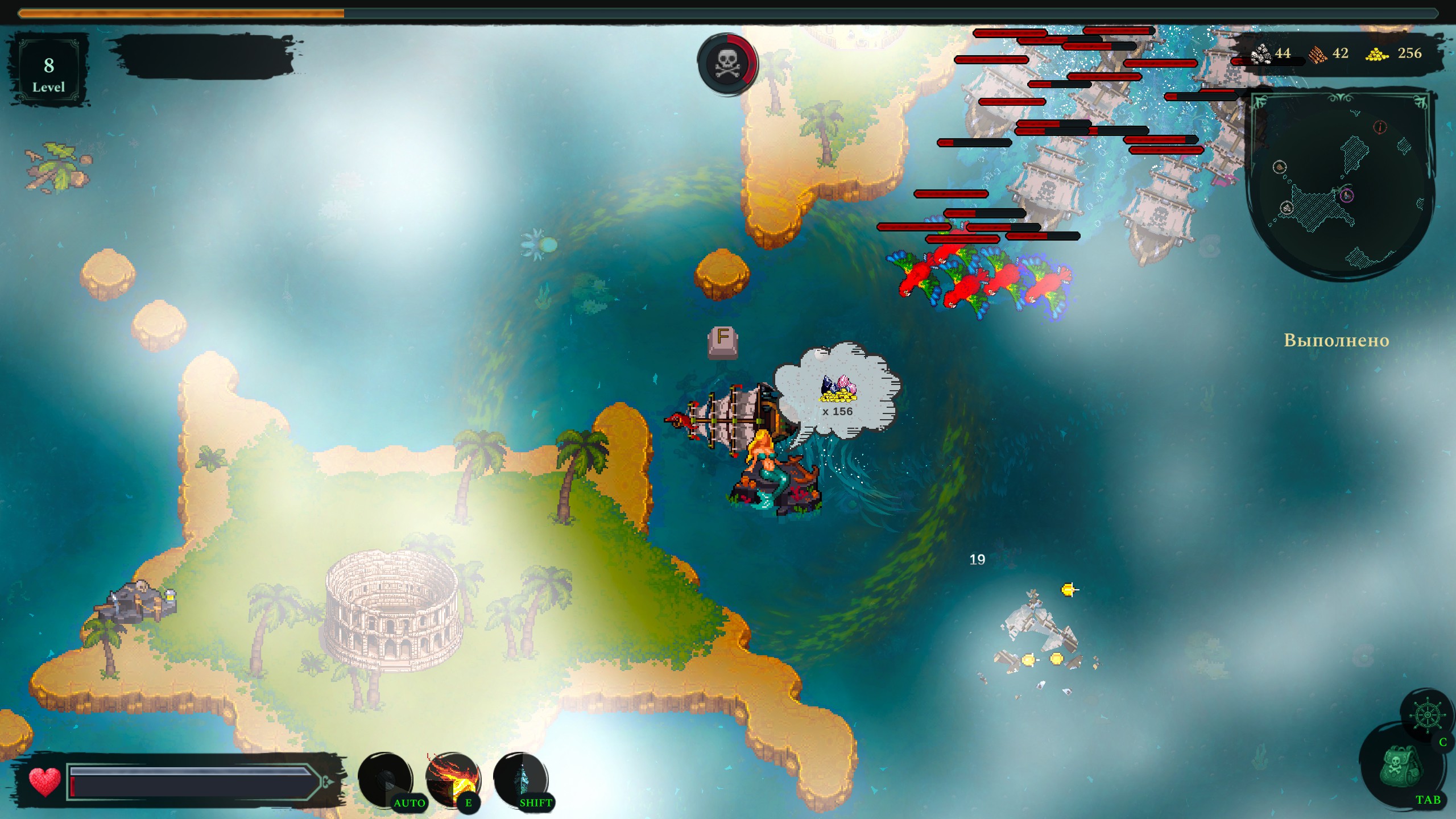 Еще у игры забавная эстетика: улучшения вам дают различные волшебные пираты в духе богов из Hades, а по карте разбросаны милые пасхалки. Например, перерисованные объекты из «Героев Меча и Магии 3» или желтая субмарина из знаменитой песни Beatles.