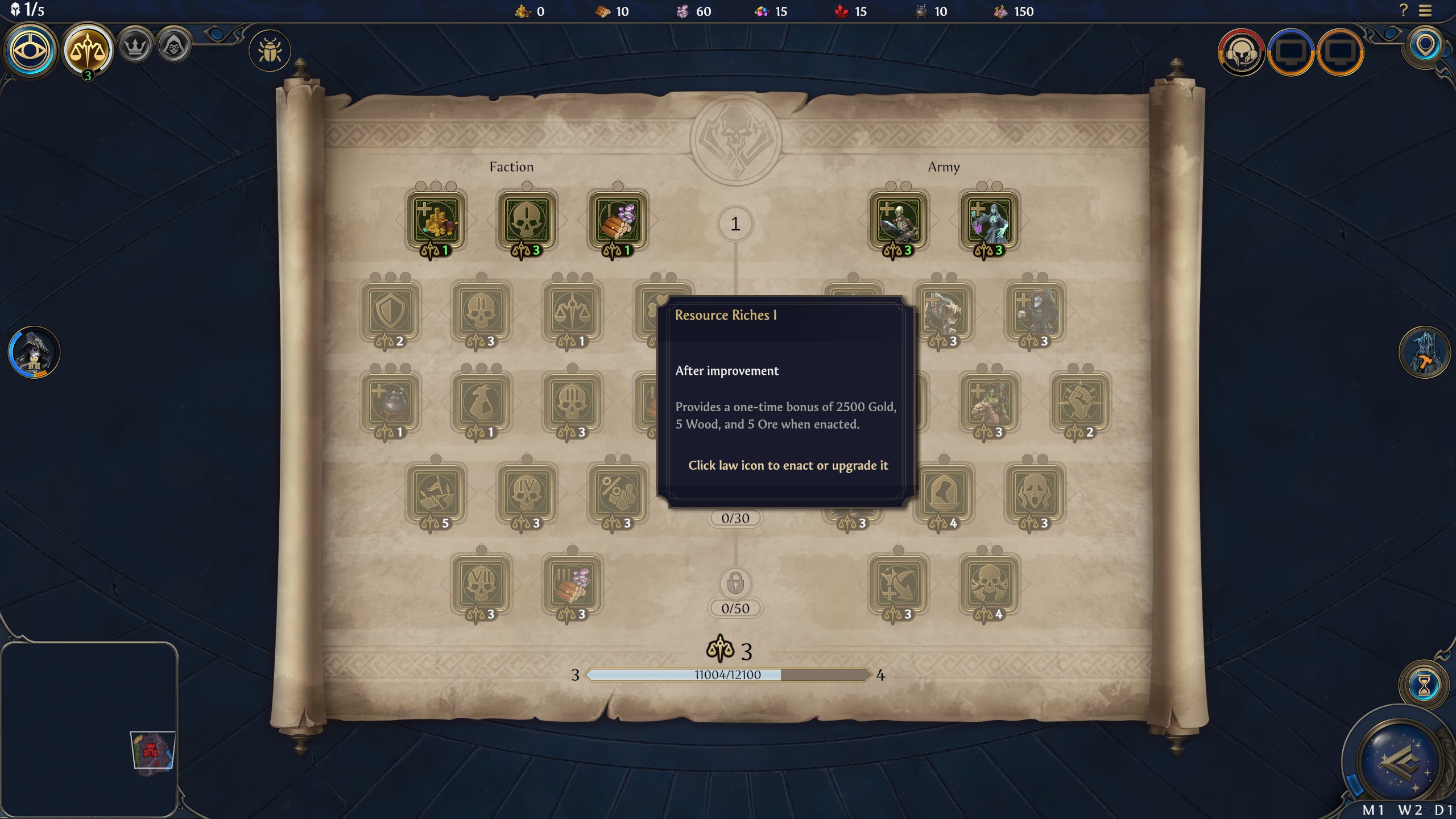 У городов есть свод законов — эдакое древо технологий, позволяющее более гибко настраивать экономику и возможности вашей армии. Больший приток денег, прирост существ в казармах, бонус к характеристикам всех ваших героев на карте и так далее. Очки законов копятся со временем в зависимости от количества замков в ваших владениях и их прогресса застройки.