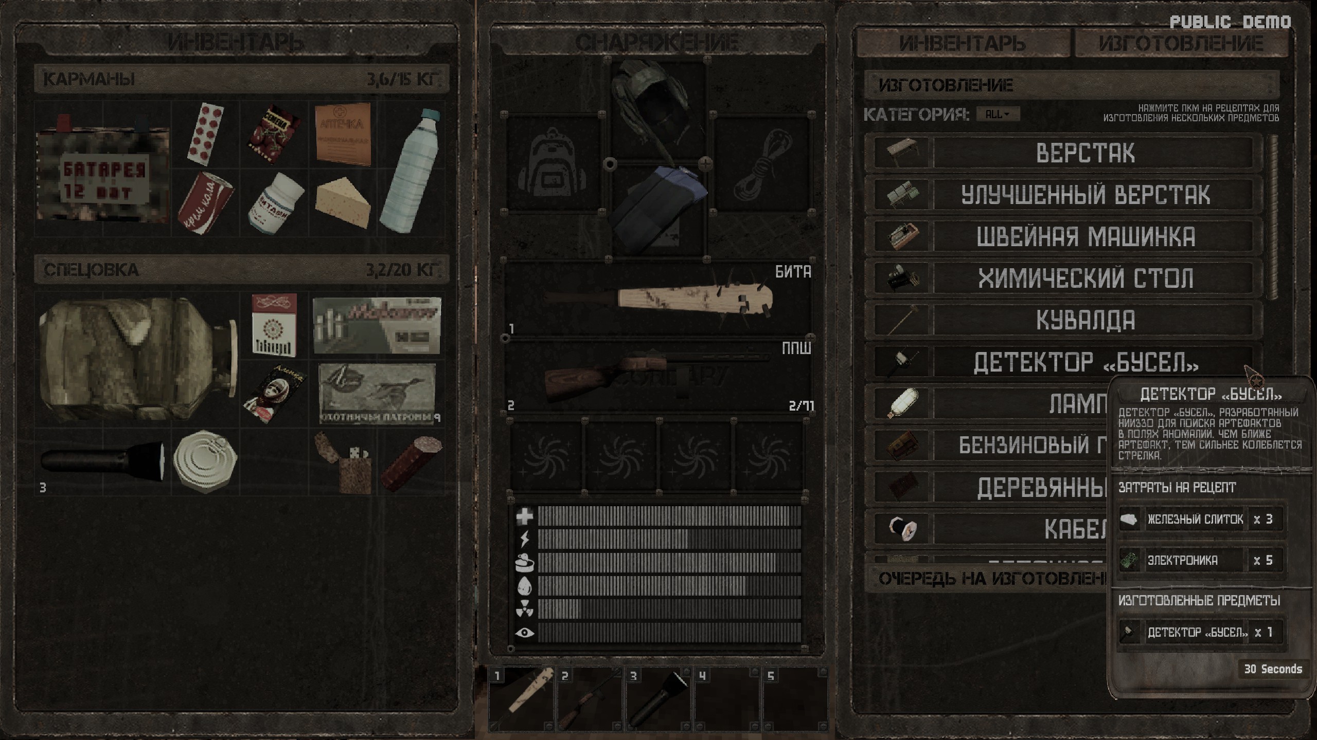 Misery может отпугнуть примитивной графикой. Но если переступить через это, то вам откроется удивительно качественная игра в жанре «сталкинг-хабаринга по радиоактивным заброшкам». Все нужные механики уже работают! Сбор лута ведется в ограниченный инвентарь, который можно расширять сумками и карманами одежды. Есть взаимосвязанные системы голода, жажды, психики и радиационного заражения. Поиск артефактов с помощью детектора среди разнообразных аномалий. Крафт, ограниченные по времени рейды (если задержаться на поверхности слишком долго — можно попасть под выброс смертельной энергии), расчет ресурсов и даже строительство.
