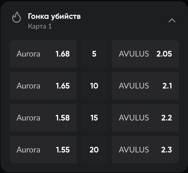 Букмекер предлагает цель – 5, 10, 15 или 20 убийств. Игроку нужно выбрать команду и команду и необходимый порог.