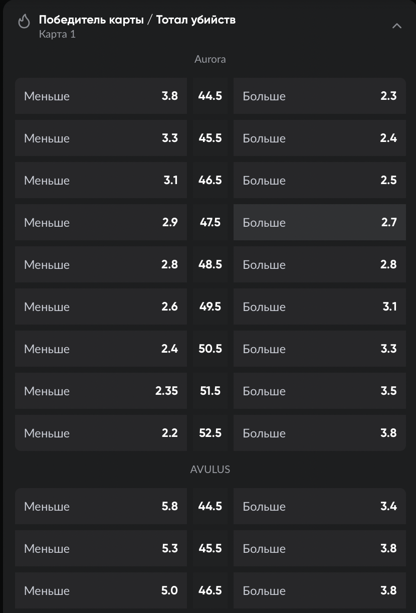 - Проверяются оба условия: если победитель карты совпадает выбором, а тотал убийств попадает в выбранный диапазон – ставка выигрывает.