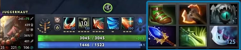 А план по игре простой: вступать в драки только с готовым Omnislash и нужными таймингами предметов, а остальное время — фармить крипов, Торменторов, Рошанов и всё подряд с Battle Fury, ведь Джаггер делает это почти быстрее всех в Доте. Работает практически всегда.