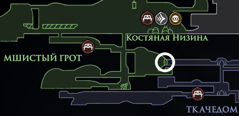 Самый первый Ткачедом, доступный в начале игры. От стартовой точки спуститесь вниз и идите направо, пока не увидите дверь с узором паутины. Внутри вы найдете мини-зону с собственным чекпоинтом и механизмом посередине. Активируйте его, чтобы получить карту Ткачедома Атла.