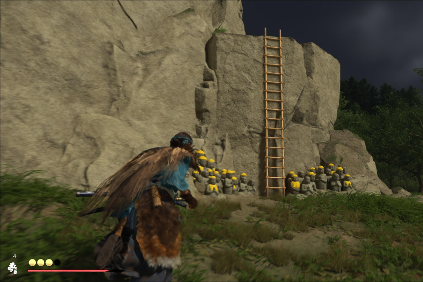 Сначала взберитесь на скалу, отмеченную на карте как «Убежище на скале». Наверху вы найдете записку, в которой сказано, что ронин, укрывшийся здесь, не любит музыку. Сыграйте рядом с запиской на самисэне. После небольшой катсцены у соседней скалы появится лестница, по которой можно подняться и добраться до алтаря.