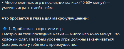 ИИ-тренер выдает стены информации, где часто повторяется и противоречит сам себе. Буквально в соседних абзацах сначала хвалит за то, что умею играть в лейте, а затем ругает и называет показатель «красным флагом».
