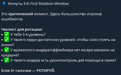 По понятным причинам советы заточены под базис игры на высших рангах. Например, после 6-й минуты мне советуют перемещаться по карте, чтобы не воровать опыт у кора. Не спорю, это база для каток на хай-MMR, но готов ли к этому мой керри или оффлейнер? Как показывает практика, тиммейт на линии моментально умирает, сделай ты хотя бы шаг в сторону мида.