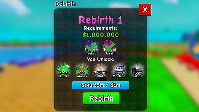 Но доступ к этому чуду техники не бесплатен. На старте игры ваш уровень возрождения равен единице, и машина заблокирована. Чтобы подняться до второго уровня, активируйте функцию «Rebirth» через кнопку в левом углу интерфейса. Это потребует жертв: двух редких секретных Brainrots – Los Tralaleritos и Vacca Saturno Saturnita – плюс кругленькую сумму в 1 млн. внутриигровой валюты. Эти особые существа могут выпасть случайно во время тренировок или быть получены в обмене с другими игроками. После активации функции «Rebirth» все ваши накопления — деньги и Brainrots — обнуляются, но взамен вы получите доступ к машине слияния. Это как перерождение – потеря ради большего могущества. Не торопитесь с этим шагом – убедитесь, что у вас есть все необходимое, чтобы не остаться с пустыми руками.