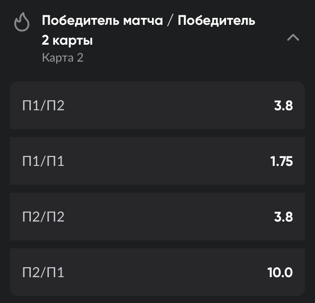 Если фаворит проигрывает после первой карты, можно попробовать его победу на второй карте + победу в матче. Так итоговый коэффициент получится выше.