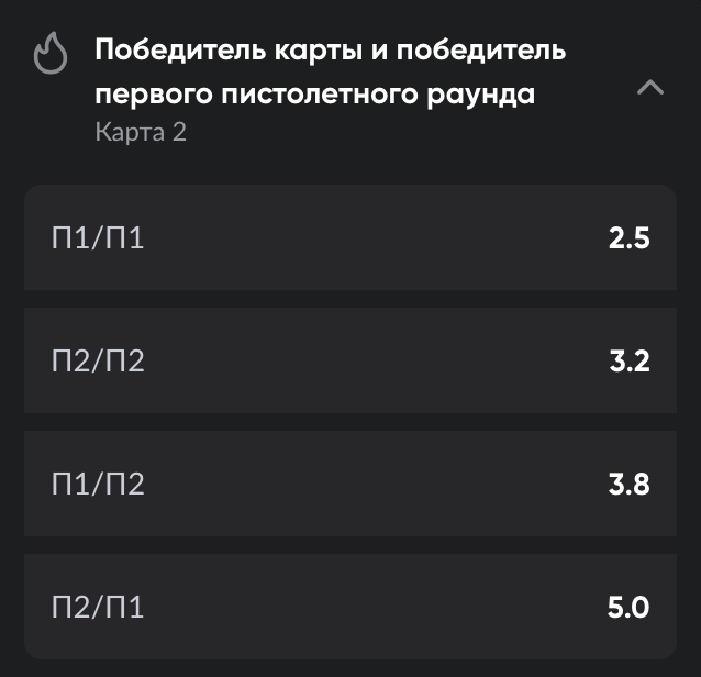 Этот рынок объединяет ставку на победителя первого пистолетного раунда и победителя карты. Встречается в CS 2 и Valorant.