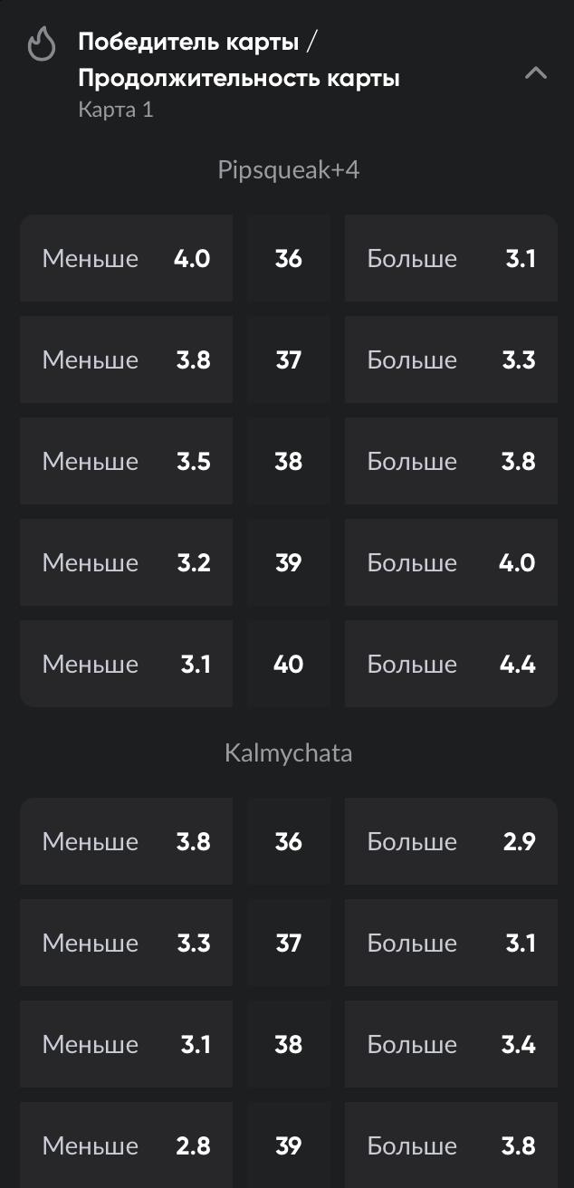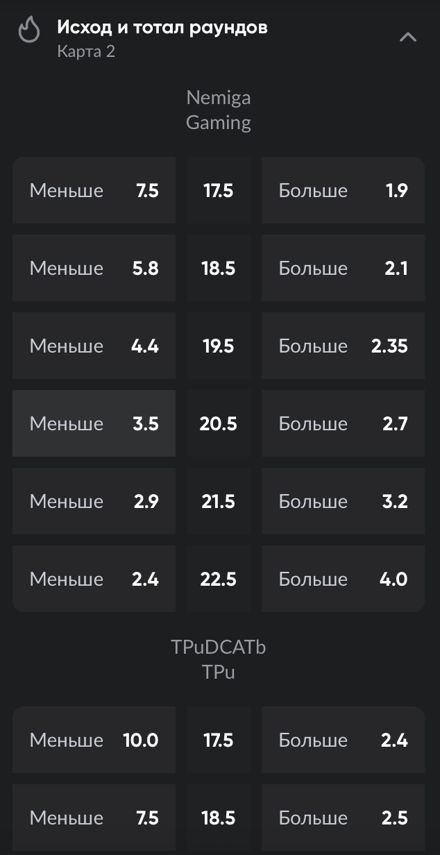 Встречается в CS 2 и Valorant. Предлагает угадать не только победителя, но и ход игры. Помимо итогового исхода игрок должен предсказать какое количество раундов будет сыграно: больше заданного числа или меньше.