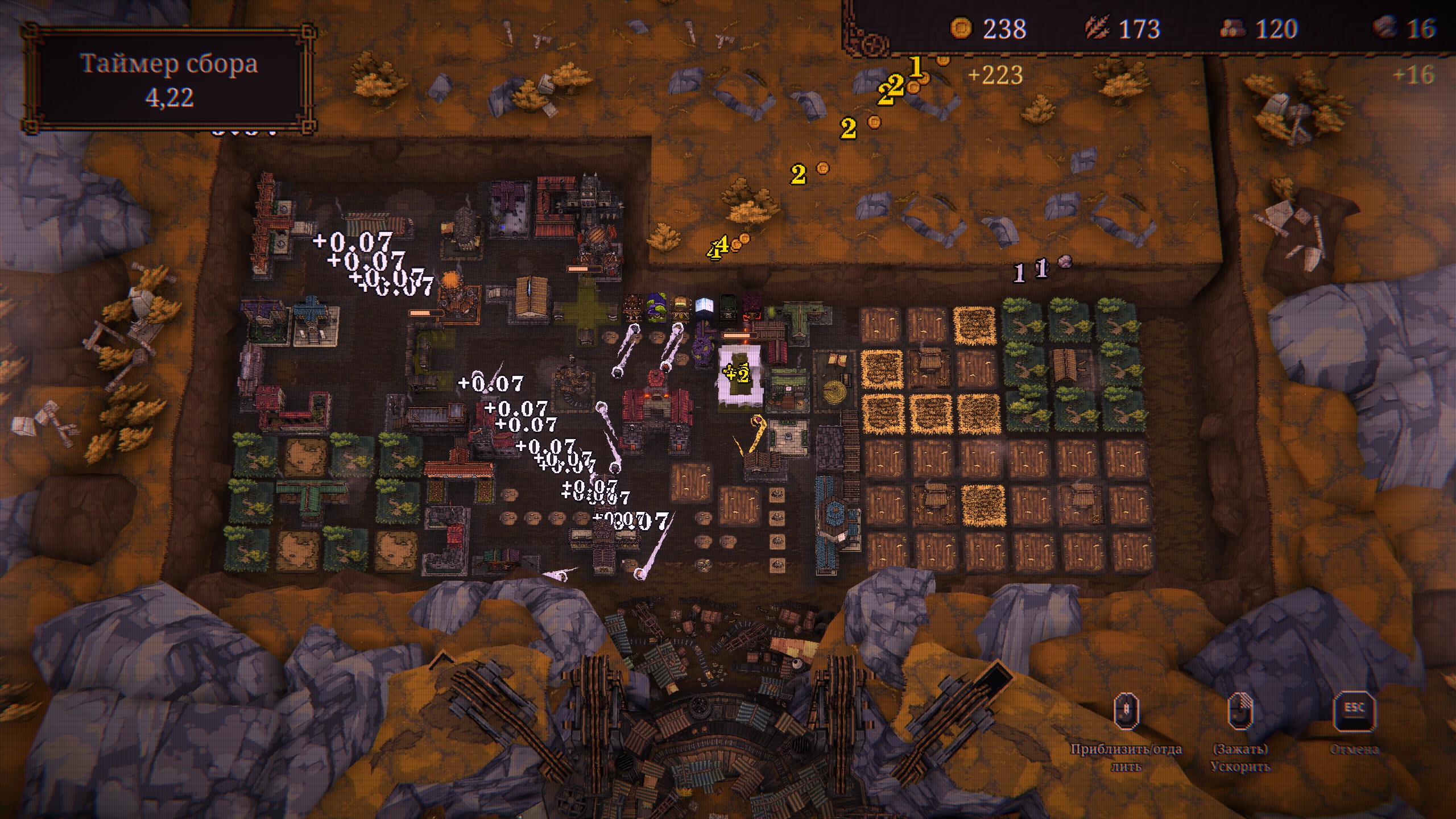 В подземельях вы добываете золото, ресурсы и чертежи зданий. Все это идет на отстройку небольшого поселения около Шарвилонской бездны. Жилые дома открывают новых героев, поля позволяют собирать дополнительные ресурсы между спусками в яму, различные академии и лавки алхимиков повышают характеристики персонажей. А некоторые мастерские дают уникальные возможности – например, расширяют максимальное число шаров и талисманов в забегах.