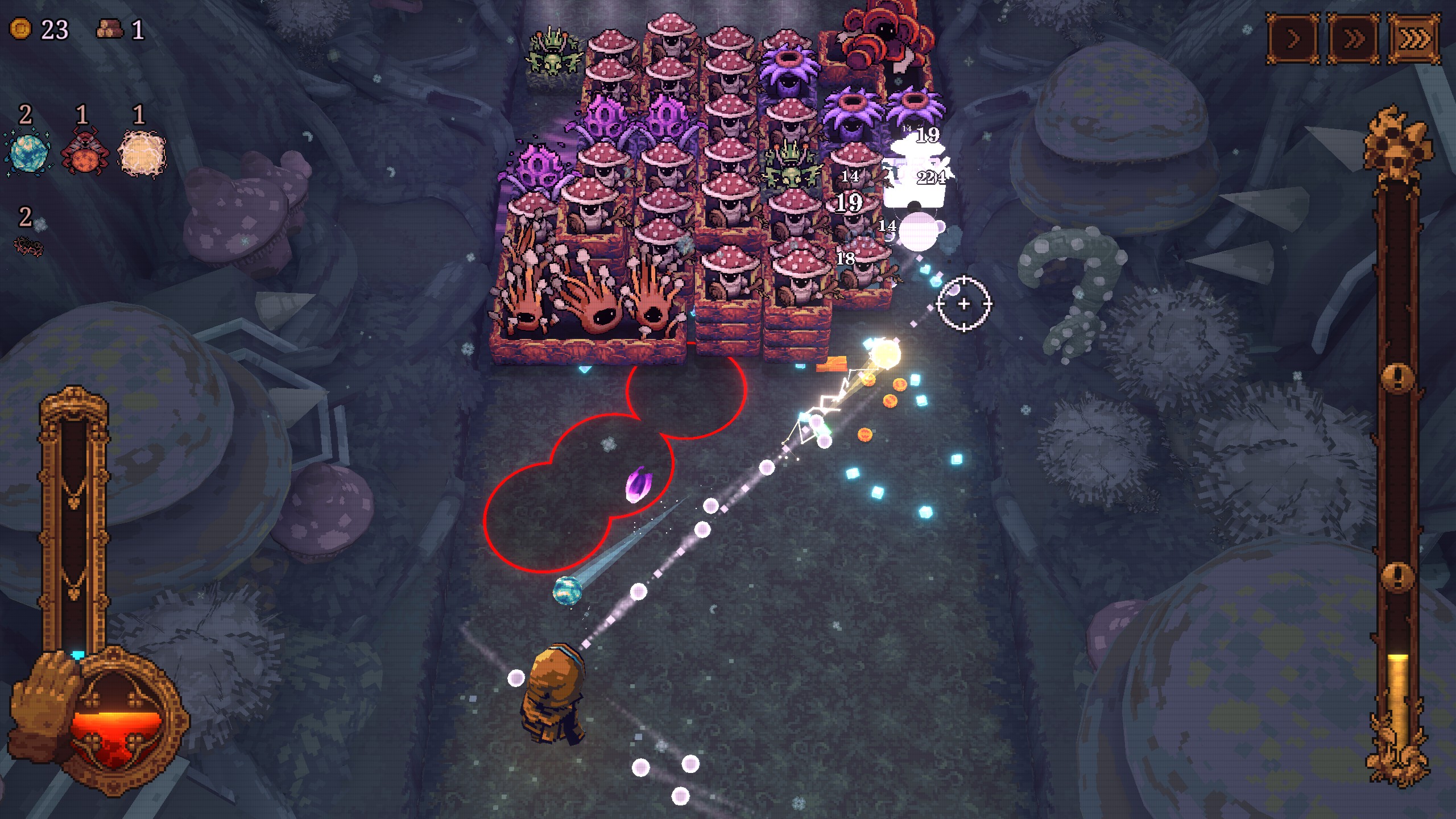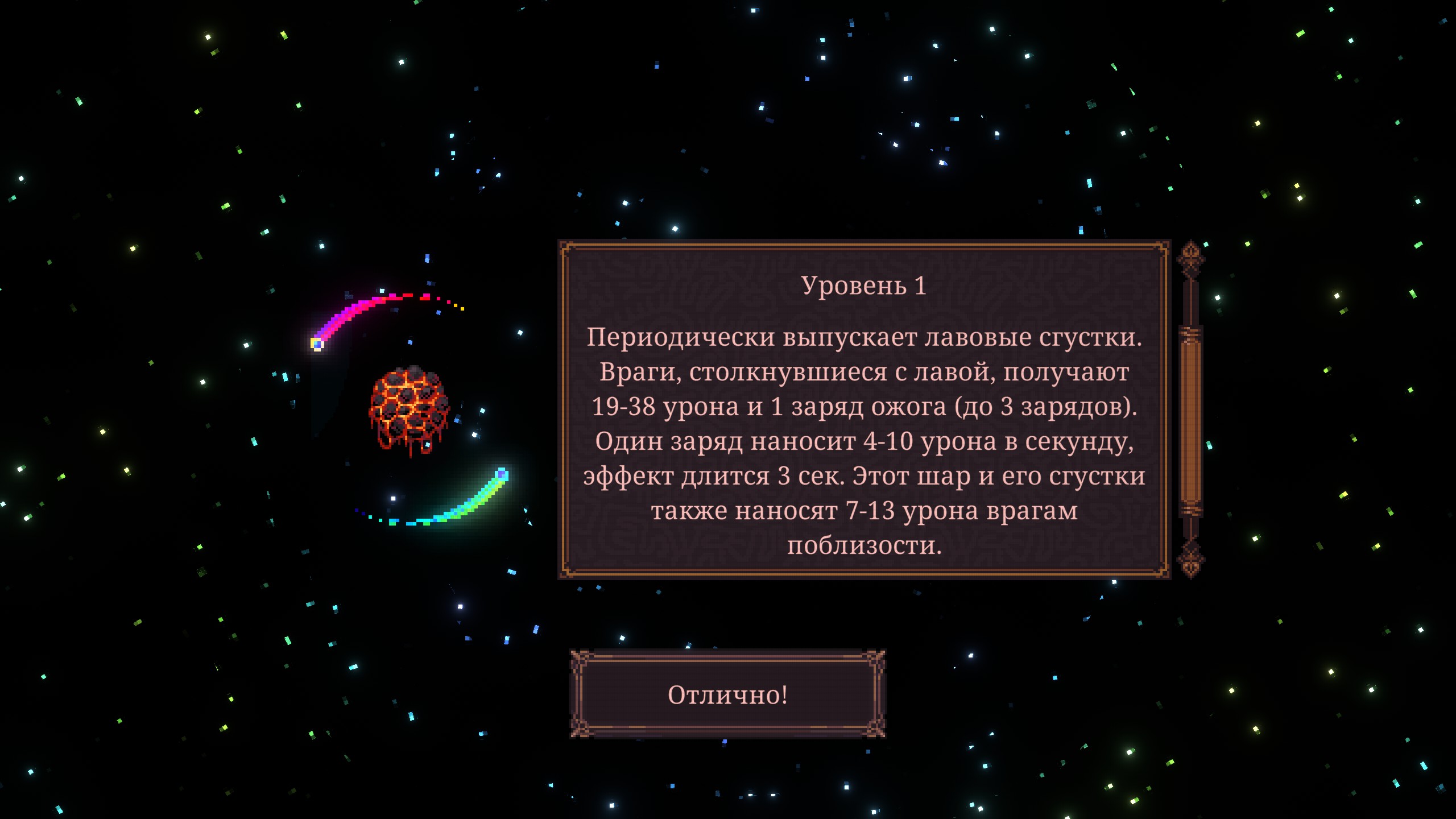 Дальше начинается комбинаторика, знакомая всем, кто хоть раз запускал Vampire Survivors или ее клоны. С врагов выпадают самоцветы, за сбор которых дают уровни прокачки. За каждый вы можете взять новый шар или какой-нибудь талисман (прибавка к урону, увеличение скорости, бонус к критическому урону и так далее). Ну и характеристики героя также растут с прокачкой.