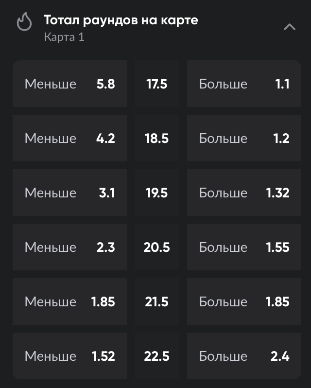 Тотал меньше (ТМ) означает, что вы прогнозируете, что карта завершится раньше заданного порога. Например, ставка ТМ 20,5 выиграет, если сыграно 20 или меньше раундов.