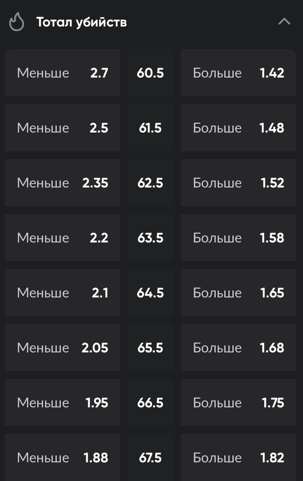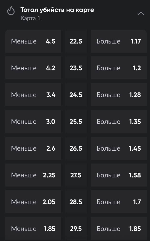 Тотал меньше (ТМ) – игрок прогнозирует, что в матче будет меньше убийств, чем заданное число. Ставка ТМ (26,5) означает, что суммарное количество килов будет 26 или меньше.