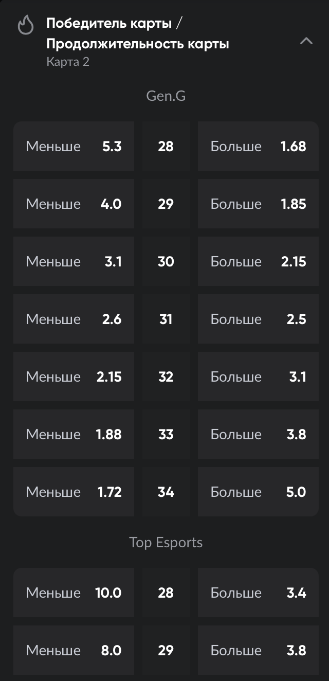 «Победитель карты + продолжительность карты» – это комбинированная ставка, где нужно предсказать две вещи одновременно: какая команда выиграет карту, и будет ли длительность карты больше или меньше заданного тотала минут. Для выигрыша важно, чтобы оба прогноза совпали. Если одно из условий не выполняется, то ставка считается проигранной.