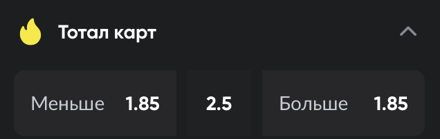 Тотал меньше (ТМ) означает, что команды сыграют меньшее количество карт, чем указано в ставке. Чтобы прошла ставка ТМ (2,5) составы должны сыграть 2 и менее карт.