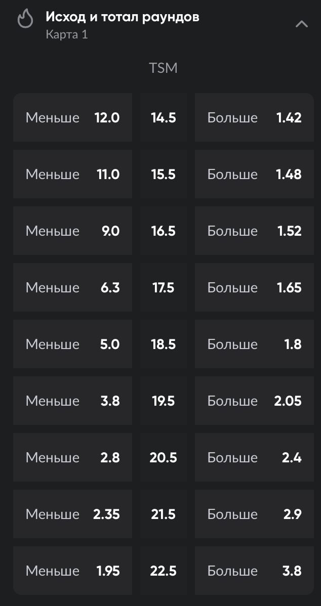 Ставка «Исход + тотал раундов» – это комбинированное пари, в котором игрок одновременно прогнозирует исход карты или матча и количество сыгранных раундов.