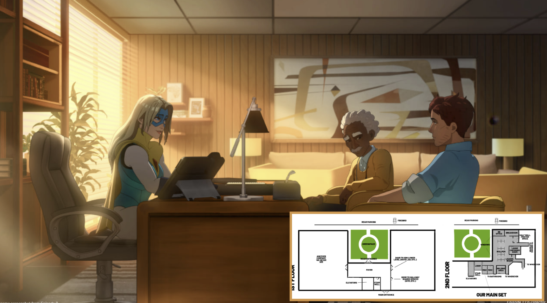 Офис нарисован в ретро-стиле 90-х с приглушенной цветовой палитрой. Вышло уютно и с легким налетом фанка. Разработчики создали настоящие план-схемы, где все должно быть логично: расположения кухни, зоны отдыха, конференц-зала и даже лифта.