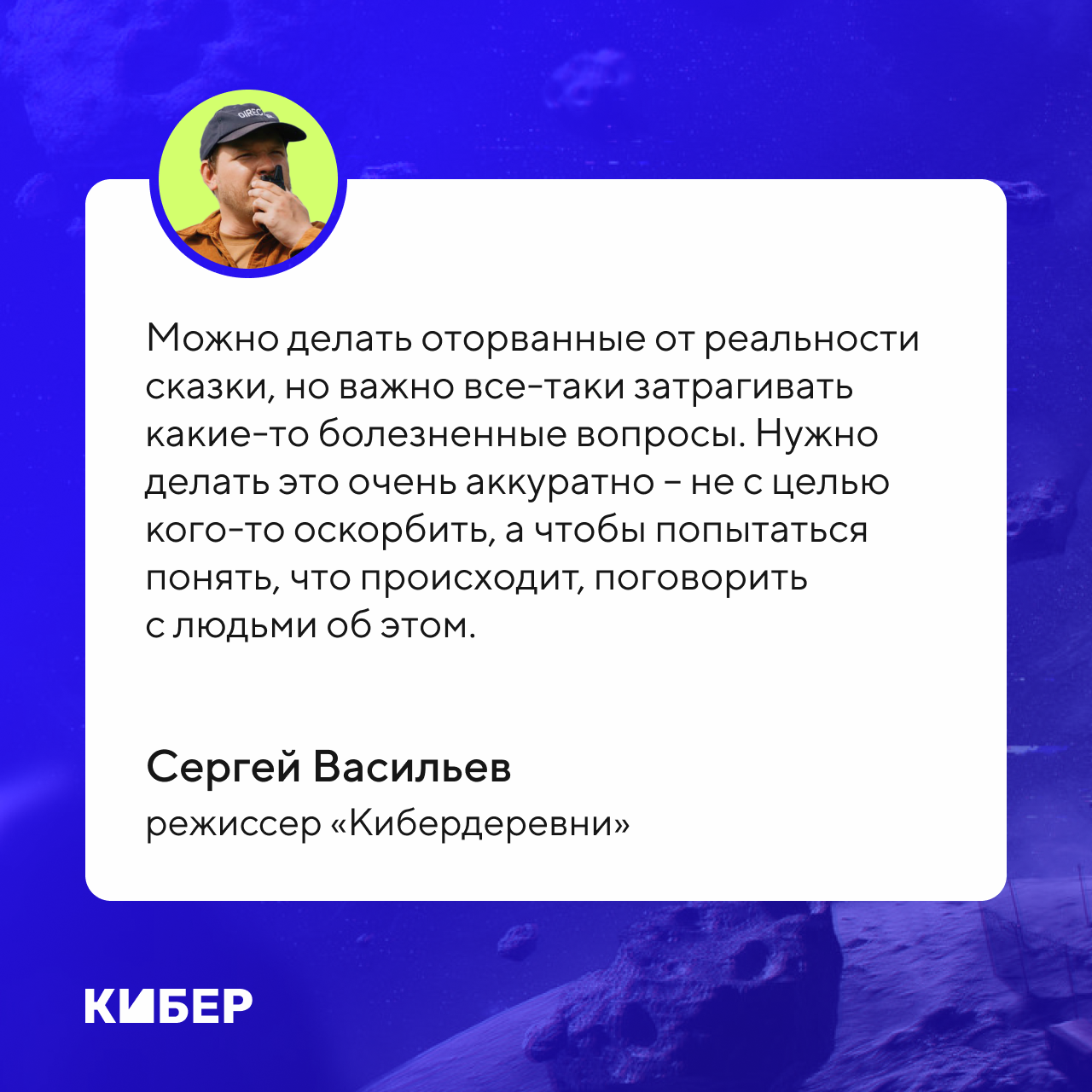 – Для меня «Кибердеревня» – это прежде всего социальная сатира. Я пересматривал первый сезон и вновь удивился, насколько смело вы говорите о вещах, о которых сейчас обычно стараются молчать. Для тебя важно, чтобы темы, которые поднимает шоу, резонировала с обществом, чтобы в сериале обсуждались актуальные социальные проблемы?