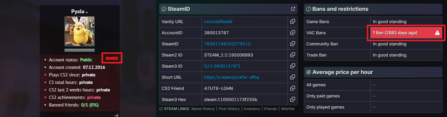 Например, посмотрите на этот аккаунт. Ему 9 лет, и 8 лет назад на нем был получен VAC-бан. Но в профиле он не отображается.