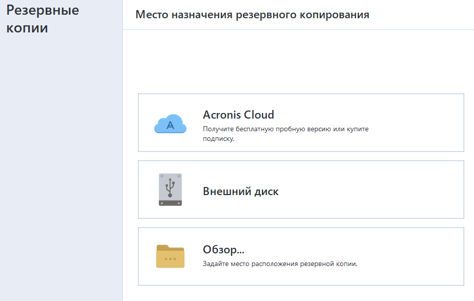 После выберите хранилище (место, куда вы сохраните копию). В качестве хранилища можно выбрать внешний носитель или указать путь, в том числе сетевой. Также зарегистрированным пользователям, оплачивающим программу, доступно облако Acronis Cloud.