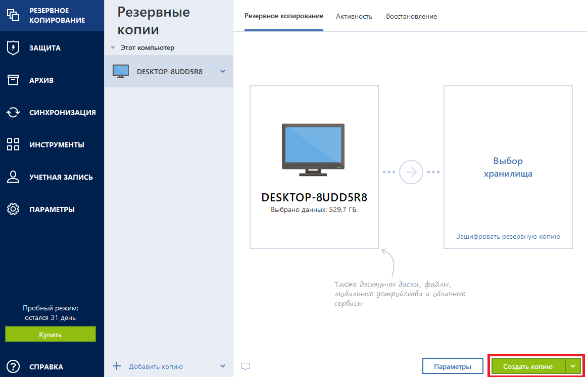 Есть множество различных программ для создания резервных копий, и даже встроенные в Windows средства. Можете воспользоваться любым из них, а мы покажем все на примере Acronis True Image. ПО платное, но есть бесплатный пробный период на 30 дней.