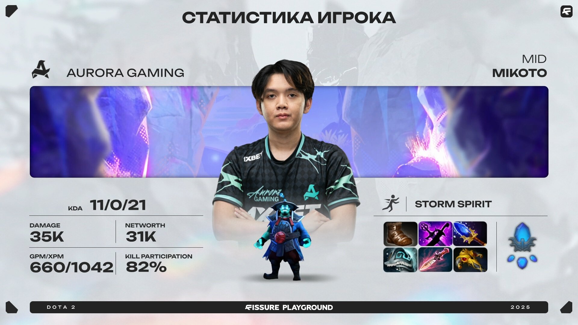 Притирка в Aurora не пройдет так же быстро, как с Panto в Team Spirit или Киритычем в BetBoom Team из-за языкового барьера, – видно, что тот же Oli испытывает явные проблемы с адаптацией. Но команда уже играет гораздо лучше, чем в первых матчах обновленного состава. Mikoto показал топовую игру на нескольких картах на FISSURE Playground 2, что вместе с отличной индивидуальной формой Найтфолла позволило Aurora сражаться и с PARIVISION, и с Team Spirit.